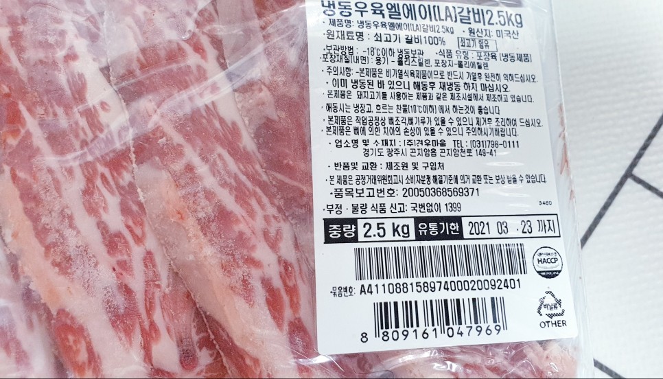 코스트코 LA 갈비 2.5kg입니다이렇게 1팩씩 합쳐서 판매합니다.색상은 빨간색이고 위쪽은 마블링도 보이고 지방도 적기 때문에 괜찮습니다.