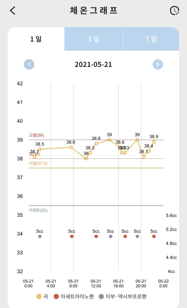 갑자기 저녁을 먹으려고 하지 않아서 한번 전쟁을 하고 ^^ 나중에 뜨거움을 느껴 열을 재보니 38.6도 컨디션이 떨어져 보이지 않았는데 뭔가 또 왔구나 하고 허둥지둥 해열제 챔프 빨강으로 먹여줘서 다행이 밤 11시에 37.2도까지 내려간걸 보고 잠깐 잤어. 하지만 1시에 재보니 38.1도 2시에 다시 재보니 38.5도 이때 교차복용해보려 맥시블펜 먹여도 떨어지지 않고 밤새 열… 해열제가 듣지 않는건 처음이라 엄청 당황스러워요 ㅜ