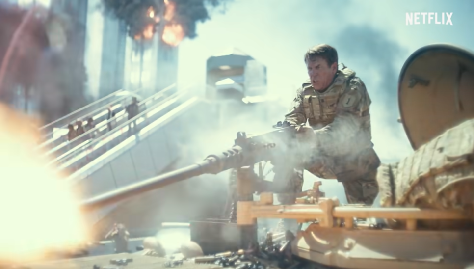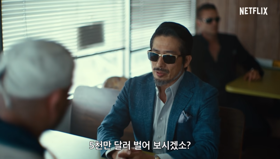 미국 대통령은 이 라스베이거스를 전술핵무기로 날려버릴 겁니다.그런데 이 라스베이거스에는 2억달러짜리 달러가 금고에 있어요. 이에 다나카는 전직 군인이자 현재는 셰프 스콧 워드(데이브 바티스타 분)에게 달콤한 제안을 합니다.
