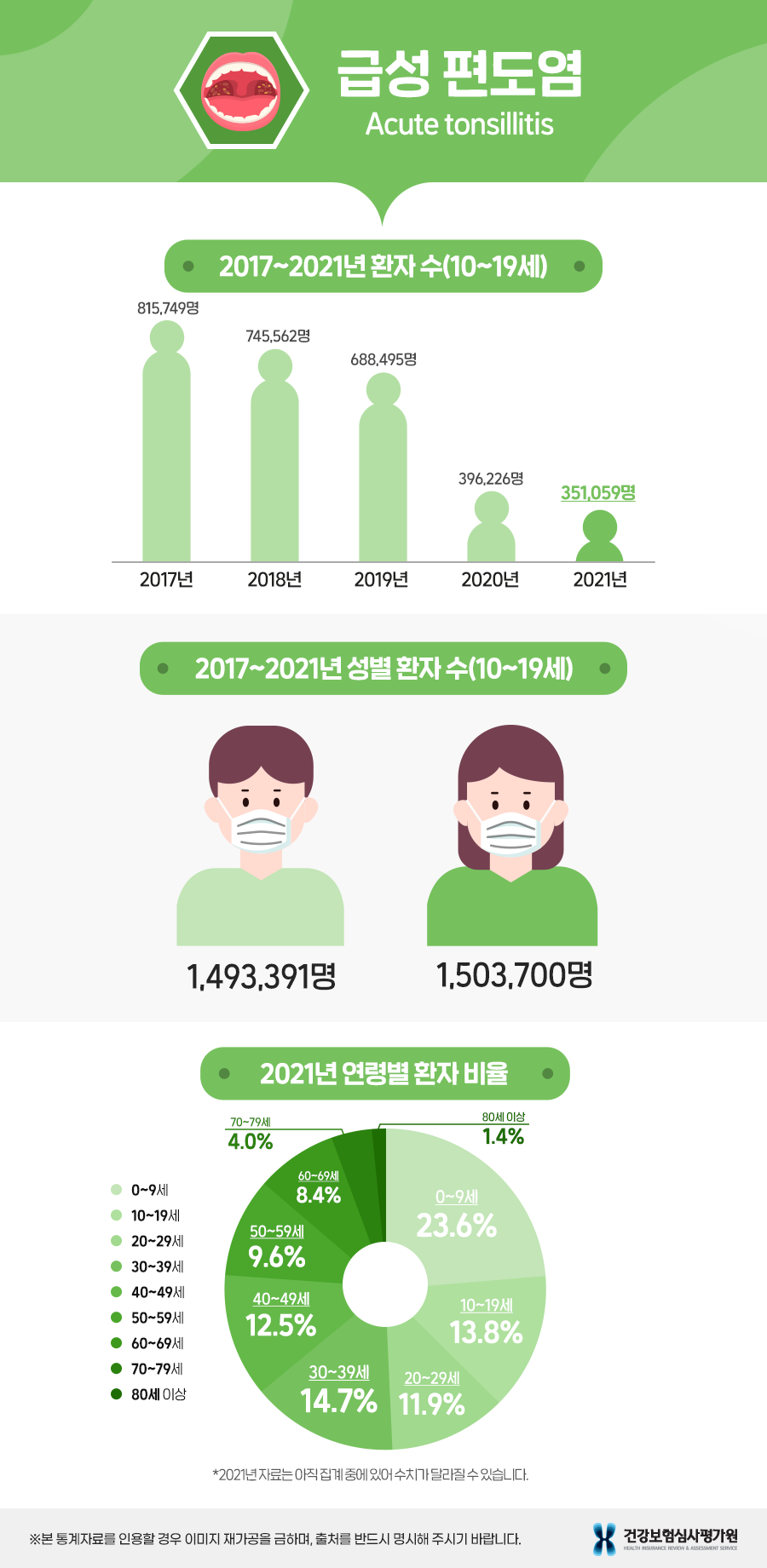 목 안쪽이 붓고 열이 나는 급성 편도염, 여러 가지 원인으로 신체의 저항력이 감소했을 때 편도 내 세균에 의해 급성 감염이 일어나는 질환입니다. 매년 10~19세 환자 수는 감소하고 있지만 여전히 청소년기 어린이들에게 많이 발생하는 질환 중 하나입니다.