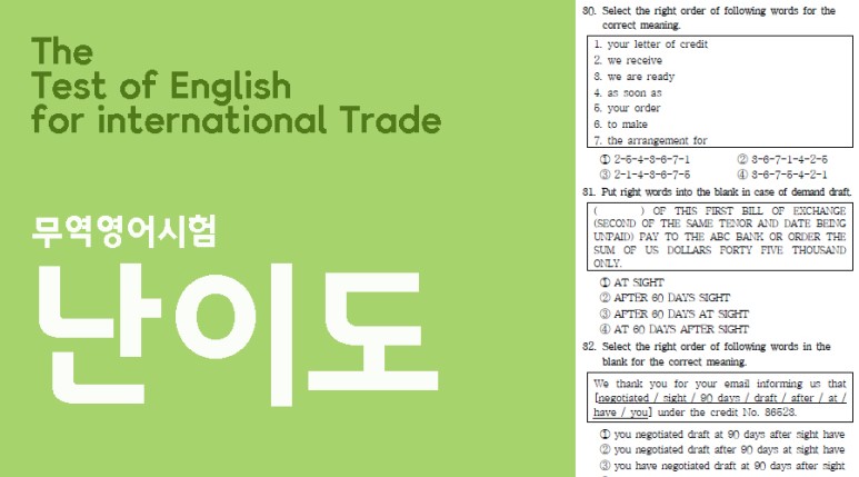 무역영어는 관세법, 금융법, 보험, 국제법 등의 전문용어가 뒤섞여 있기 때문에 문형과 문맥의 체감 난이도는 토익보다 더 어려워지고 다른 시험입니다.
