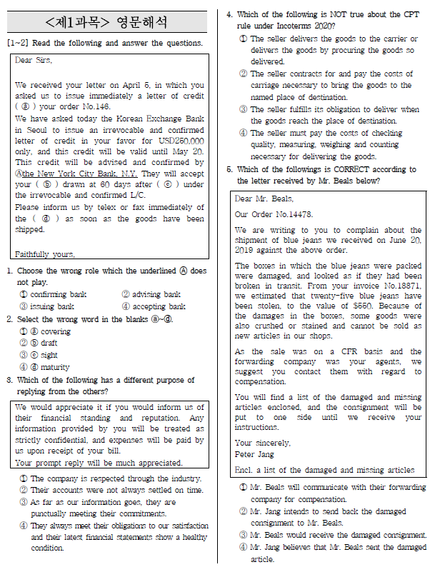 일반적으로 무역학과를 졸업하고 토익과 무역영어 두 가지를 다 본 사람들에 따르면 무역영어가 더 어려웠다고 하니까 준비하는 준취업생들은 기출문제를 많이 풀어보면 도움이 될 것 같습니다.