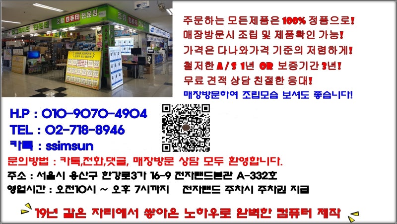 용산사무용조립PC빠른스피드좋은안전성안녕하세요^^21년의자리를지키고있는최종문실장님을인사드립니다. 오늘은 빠르고 안전한 사무실 조립 PC를 소개합니다. 인텔 I3-10100F + GT710 조합으로 구성된 컴퓨터입니다. SSD 및 HDD, ODD까지 모두 장착한 컴퓨터입니다. – 견적사양-