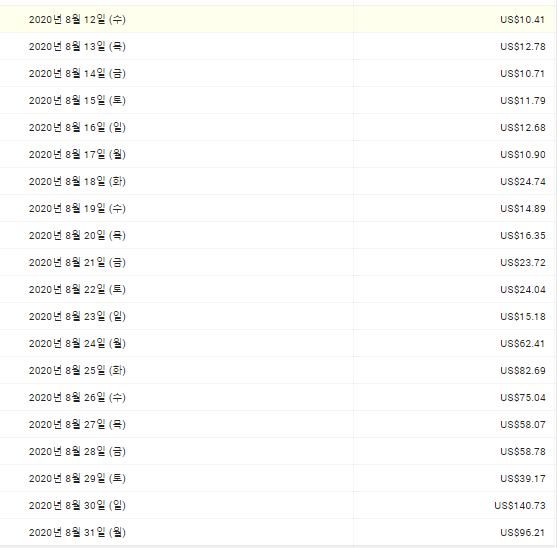 다음은 8월 1일부터 11일까지의 수익입니다. 불과 20일 전, 이때까지만 해도 한 자릿수 수익이 났어요. 그리고 어떤 깨달음을 기점으로 수익이 더 이상 떨어지지 않았던 거죠. 8월 11일이 마지막 한 자릿수 수익입니다.▼