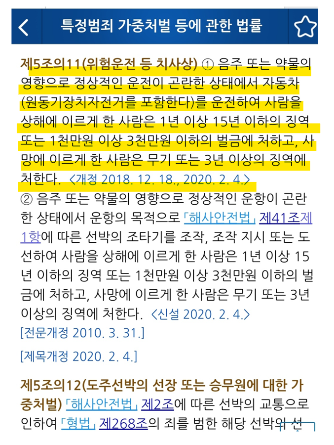 윤창호법(도로교통법 제148조의2제1항)의 위헌 판결 이후, 법의 적용은 도로교통법 제148조의2제3항의 적용을 받게 되었습니다. 동법 3항에 따르면 혈중 알코올 농도 0.030.03% 미만인 자는 1년 이하의 징역 또는 500만원 이하의 벌금, 2항에 따르면 0.08% 이상 0.2% 미만인 자는 1년 이상 2년 이하의 징역 또는 500만원 이상 1천만원 이하의 벌금, 1항에 따르면 혈중 알코올 농도 0.2% 이상의 징역 또는 2년 이상의 징역 또는 1천만원 이하의 징역 또는 1천만원 이하의 벌금, 1항에 따르면 혈중 알코올 농도 0.2% 이상의 징역 또는 처소에 처합니다. 혈중 알코올 농도 0.2%를 넘으면 위헌 결정이 내려진 148조의 2의 1항과 같은 형량에 해당합니다.