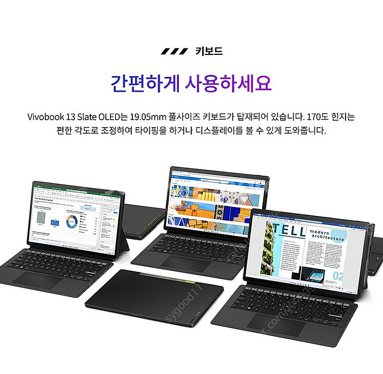 간단하게 웹서핑을 할 때는 세로 스탠드 모드, 영화 감상은 가로 모드로 전환하고 과제 제출을 위한 문서 작성을 할 때는 키보드를 장착하여 노트북 모드로 활용할 수 있습니다.ASUS 비보북 13 슬레이트 OLED는 일반 노트북과는 차원이 다르네요.
