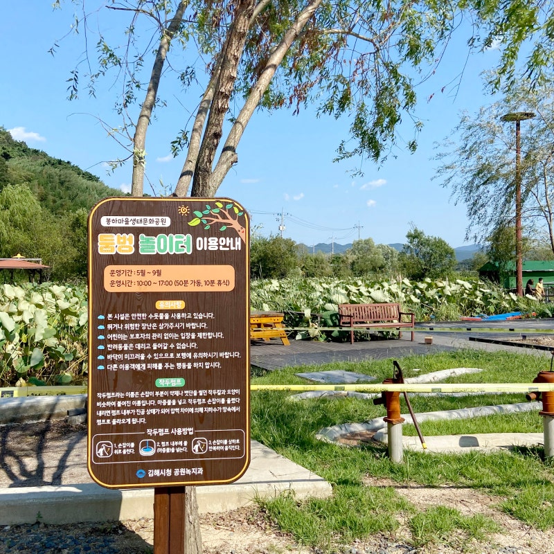 둥봉놀이터에서 볼 수 있는 ‘작두펌프’의 모습입니다.작두펌프는 자루 부분이 작두칼과 모양이 비슷해서 붙여진 이름이라고 합니다.마중물을 넣고 대추펌프의 손잡이를 올렸다 내렸다 하면 압력차에 의해 지하수가 땅속에서 펌프로 올라옵니다.체험하러 온 초등학생 아이들이 계속 펌프질을 하며 즐기고 있었습니다.