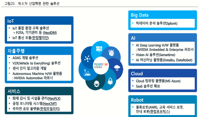 ◇ Convergence사업 부문-소프트웨어 품질을 극대화하기 위한 다양한 솔루션 및 서비스를 제공하고 또한 산업 간 융합을 통한 새로운 가치를 창출하려고 노력하고 있습니다. 디버거, 컴파일러 등을 포함한 개발 툴과 지능형 에지 디바이스(열화상 카메라 등)을 이용한 시스템 자동화 솔루션을 제공하며 이에 따른 다양한 서비스 사업(컨설팅 서비스 플랫폼 구축 서비스 등)을 통해서 수익을 창출하고 있습니다. ◇ Innovation사업 부문-미래 자동차 산업을 선도하기 위한 첨단 기술을 제공하고 스마트 솔루션의 제공에 의한 고객 가치 혁신에 도전하고 있습니다. 임베디드 OS를 포함한 자동 운전, V2X등으로 대표되는 스마트 자동차 소프트웨어 개발 솔루션을 비롯한 클라우드와 머신 데이터 분석 솔루션을 제공하며 수익 모델을 공고히 하고 있습니다. ◇ Intelligence사업 부문- 제4차 산업 혁명의 핵심 솔루션인 IoT, AI솔루션을 제공하는 프로세스 및 요구 사항 관리 솔루션에서 보안 솔루션까지 프로젝트의 완결성을 높이고 컨설팅/엔지니어링 서비스를 제공합니다. 개발 품질 및 생산성 향상 솔루션 등을 보유하고 있어 독자 개발 솔루션(지능형 IoT솔루션, 암호키 관리 솔루션)을 통해서 수익 모델을 개발하고 지속적 성장 가능성을 확보하고 있습니다.◇ 한컴 테라 인-사물과 사물을 연결하는 IoT환경 기반을 만들첨단 무선 통신 솔루션을 공급합니다. 무선 통신(3G, LTE, 5G, M2M)모듈에서 특수 기능을 가진 단말기(축산 차량 위험물 차량 단말기 등)까지 제공하고 IoT기기 관리 플랫폼과 연동하고 경쟁력을 강화하고 있습니다.◇ 한컴 로보틱스 사람을 돕는 지능형 로봇 전문 기업으로 자동 운전 등 최신 ICT기술을 융합한 지능형 로봇을 개발하고 다양한 산업에 맞춘 맞춤형 로봇을 제공하고 있습니다.◇ 한컴 모빌리티-IoT기반의 스마트 공유 주차 서비스를 제공하고 거점형 모 빌러티 생태계를 만들어 갑니다. 자체 개발한 IoT센서 기술을 통해서 주차 공간의 실시간 정보를 제공하고 쉽게 주차장 검색 예약, 결제가 가능한 모바일 애플리케이션을 통해서 수익을 창출하고 공유하는 부모 고객 서비스를 제공합니다.◇ 한컴 인베스트먼트-중소 기업 창업 지원 법 및 중소 기업 창업 지원 업무 운용 규정에 의거, 창업자에 대한 투자, 벤처 기업 육성에 관한 특별 조치 법의 벤처 기업의 투자, 창업 투자 조합 결성 및 업무의 집행 등 중소 기업 창업 지원을 주요 사업으로 있습니다.◇ Convergence 사업부문 – 소프트웨어 품질 극대화를 위한 다양한 솔루션 및 서비스를 제공하고 나아가 산업간 융합을 통한 새로운 가치를 창출하기 위해 노력하고 있습니다. 디버거, 컴파일러 등을 포함한 개발툴과 지능형 엣지 디바이스(열영상 카메라 등)를 이용한 시스템 자동화 솔루션을 제공하고 이에 따른 다양한 서비스 사업(컨설팅 서비스, 플랫폼 구축 서비스 등)을 통해 수익을 창출하고 있습니다. ◇ Innovation 사업부문 – 미래 자동차 산업을 선도하기 위한 첨단기술을 제공하며 스마트 솔루션 제공을 통한 고객가치 혁신에 도전하고 있습니다. 임베디드 OS를 포함한 자율주행, V2X 등으로 대표되는 스마트 자동차 소프트웨어 개발 솔루션을 비롯해 클라우드와 머신 데이터 분석 솔루션을 제공하며 수익 모델을 공고히 하고 있다. ◇ Inteligence 사업부문 – 4차 산업혁명의 핵심 솔루션인 IoT, AI 솔루션을 제공하고 프로세스 및 요구사항 관리 솔루션부터 보안 솔루션까지 프로젝트 완결성을 높이는 컨설팅/엔지니어링 서비스를 제공합니다. 개발 품질 및 생산성 향상 솔루션 등을 보유하고 있으며 자체 개발 솔루션(지능형 IoT 솔루션, 암호키 관리 솔루션)을 통해 수익 모델을 개발하여 지속적인 성장 가능성을 확보하고 있습니다.◇ 한컴테라진 – 사물과 사물을 연결하는 IoT 환경 기반을 만드는 첨단 무선통신 솔루션을 공급합니다. 무선통신(3G, LTE, 5G, M2M) 모듈부터 특수기능을 가진 단말기(축산차량, 위험물차량단말기 등)까지 제공하며 IoT 디바이스 관리 플랫폼과 연동하여 경쟁력을 강화하고 있습니다.◇ 한컴로보틱스 – 사람을 돕는 지능형 로봇 전문기업으로 자율주행 등 최신 ICT 기술을 접목한 지능형 로봇을 개발하여 다양한 산업에 맞는 맞춤형 로봇을 제공하고 있습니다.◇ 한컴모빌리티 – IoT 기반 스마트 공유주차 서비스를 제공하여 거점형 모빌리티 생태계를 만들어갑니다. 자체 개발한 IoT 센서 기술을 통해 주차 공간의 실시간 정보를 제공하고 간편하게 주차장 검색, 예약, 결제가 가능한 모바일 애플리케이션을 통해 수익을 창출하고 공유하는 부모 사용자 서비스를 제공합니다.◇ 한컴인베스트먼트 – 중소기업창업지원법 및 중소기업창업지원업무 운용규정에 따라 창업자 투자, 벤처기업육성에 관한 특별조치법에 따른 벤처기업 투자, 창업투자조합 결성 및 업무 집행 등 중소기업창업지원을 주요 사업으로 하고 있습니다.