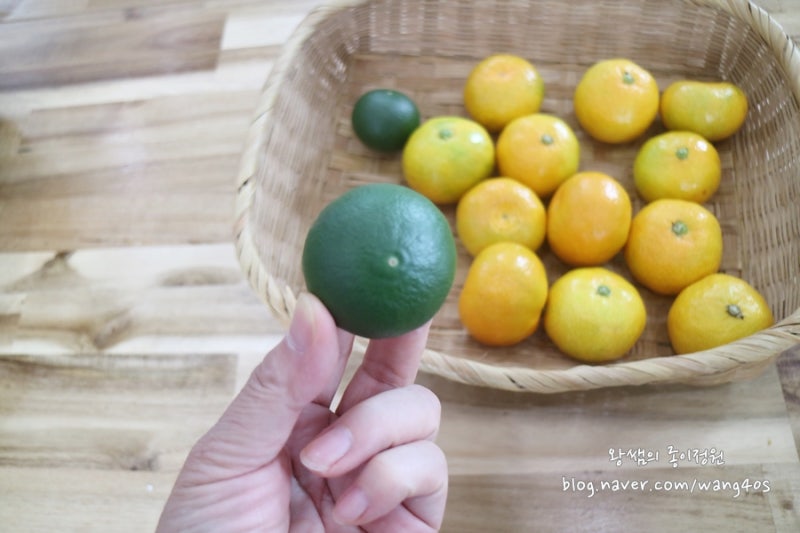 12,000ウォンのバスケットを購入するとブリキバスケットを配りますが、そこにみかんをいっぱい詰めればいいです。1バスケットは約2.5kgを収穫すると思ってください。 ハサミ1個と手袋1個がバスケットの中に用意されていて、そのまま持って使えばいいんです。