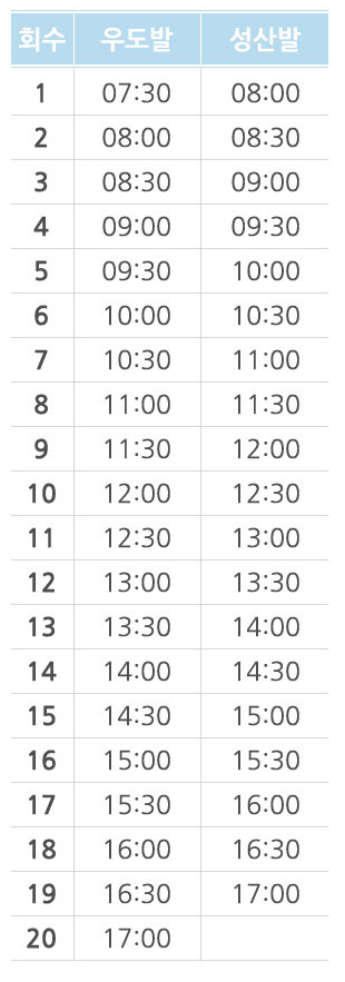 우도행 배 시간표래요. 사실 큰 의미는 없는 것 같아요. 30분 간격의 수시로 운항하는 배이기 때문에 시간에 맞춰 운항하지는 않았습니다. 큰 배라 예약은 따로 안하셔도 됩니다.