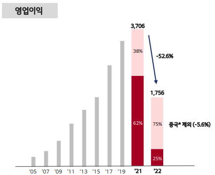 LG생활건강 뷰티 부문에서 3분기 매출과 영업이익 모두 큰 폭으로 감소하고 있다.K뷰티 특성상 중국이 매출에서 차지하는 비중이 크지만 2022년에는 중국의 제로 코로나 봉쇄로 소비 자체가 위축되고 정부 제재 그리고 중국의 애국 소비 열풍으로 중국 수출이 크게 감소하고 있다.