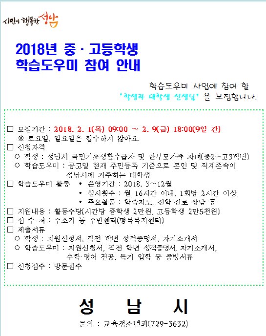 사업기간 2022년 3월~12월 사업내용 성남시 가동성 대학생 선생님을 1:1 매칭하여 주2회 1일 2시간씩 수업진행지원대상자 신청자격(중·고생, 청소년)1) 성남시 주민등록을 둔 2) 국민기초생활보장법에 따른 수급자, 차상위계층, 법정한부모, 다문화가족, 북한이탈주민 자녀, 학교외 청소년 학습도우미 신청자격 1) 성남시에 주민등록을 둔 2) 대학생 학습도우미수당 시간당 2만원씩 월 32만~40만원 신청장소 성적증명서, 동학년 재신청서, 거주지신청서, 행정서류신청서