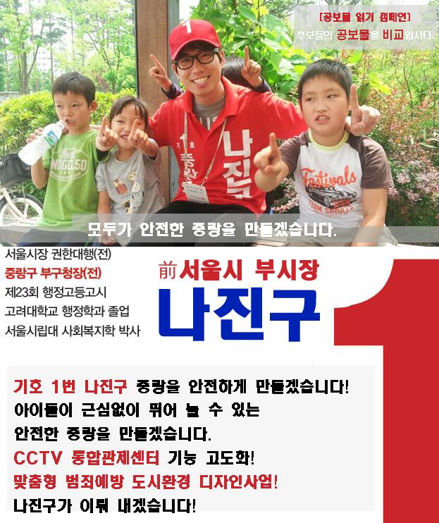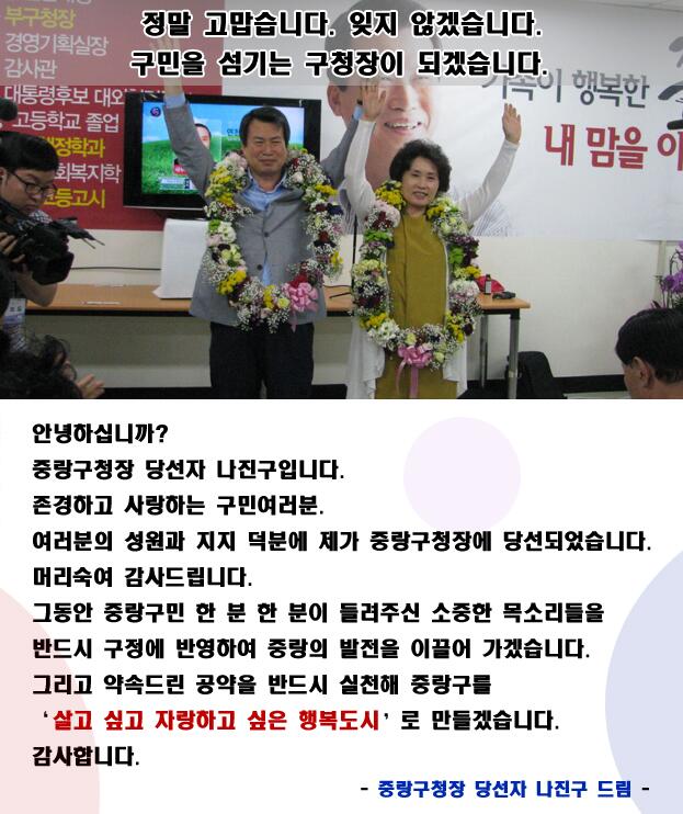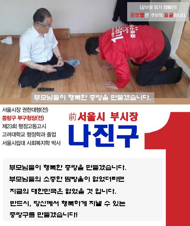 상인이나 구민분들은 재개발에 대한 관심이 많았는데요.모아타운에 대한 기대감을 표시해 주었습니다.중랑구민분들의 삶의 질을 높이는 재개발(모아타운) 사업, 신속히 추진하여 반드시 해내겠습니다.항상 주민의 삶, 주민의 행복을 최우선으로 생각하는 중랑구청장 예비후보 나진구가 되겠습니다.감사합니다。중랑구청장 예비후보 나진구 약력 제9대 중랑구청장 전 서울특별시장 권한대행 전 서울특별시 행정부시장 전 중랑구 부구청장 – 고려대학교 행정학과 졸업 – 서울시립대학교 사회복지학 석사/박사