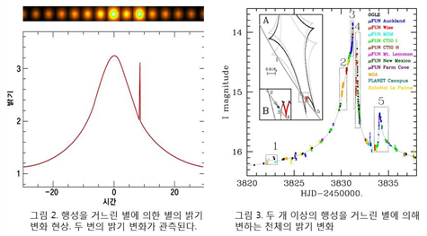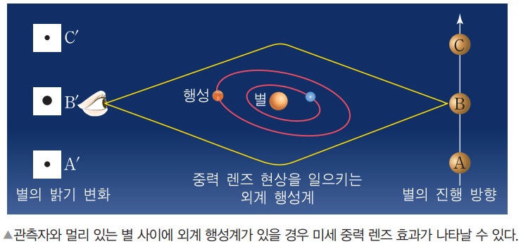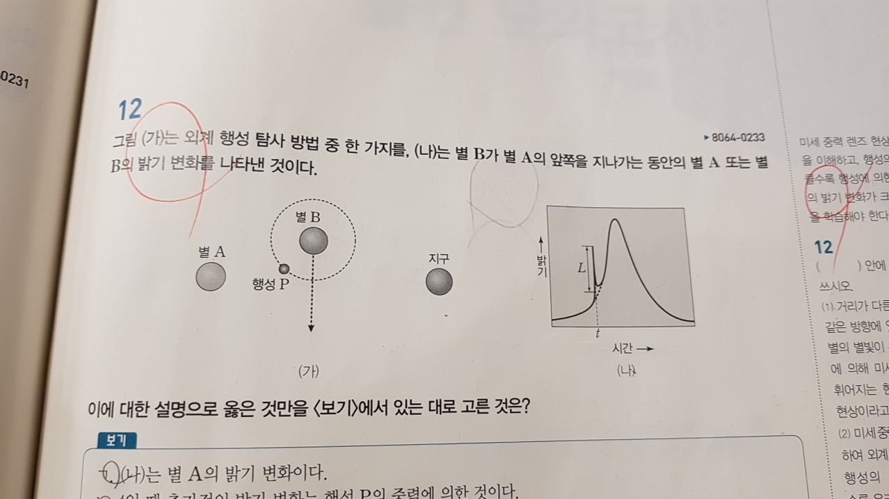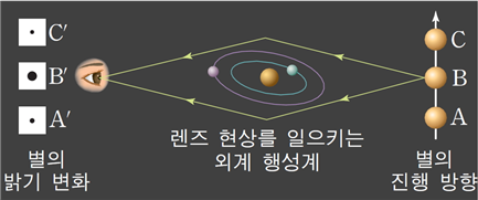 ㉠식 현상은 반경이 클수록 중심성이 행성에 묻혀면적이 크고 중심성의 밝기의 변화가 커서 행성의 존재를 확인하기 쉽습니다. 특히 행성의 중심성의 밝기 변화의 차이는 반경의 제곱 정도로 차이가 있습니다. 간단히 설명하면 A란 행성으로 중심 별의 밝기의 변화가 0.001% 줄었고 B란 행성으로 중심 별의 밝기의 변화가 0.004% 줄었다면 B행성은 A행성보다 반경이 2배 큰 것으로 나타납니다.㉡식 현상은 행성의 공전 주기가 빠를수록 행성의 존재를 확인하기 쉽습니다.㉢식 현상은 행성의 공전 궤도면이 관측자의 시선 방향과 나란히 있는 경우에는 관측이 유리하고 수직에 가까운 경우에는식 현상이 나타나지 않기 때문에 행성의 존재를 확인하기 어렵습니다.㉣ 행성의 공전 궤도면이 나란히 있어 중심성의 시선 속도의 변화와 생리 현상을 함께 관측하면, 행성의 밀도가 나타납니다. 이는 중심성의 시선 속도 변화를 통해서 행성의 질량을 알 수, 식 현상을 이용하고 행성의 반경을 알 수 있어 밀도를 알 수 있습니다.㉤식 현상을 이용하고 행성의 대기 성분을 관측할 수 있습니다. 이는 식 현상이 일어날 때 중심성에서 방출된 전자파가 행성의 대기를 통과하고 관측자에 오면 대기 성분에 의한 흡수선이 관측될 가능성이 있기 때문입니다.㉥식 현상은 행성의 질량과 관측자로부터의 거리와 상관 없어요.-미세 중력 현상을 이용하는 방법[참고 자료 5] 중력에 의한 공간 왜곡: 중력은 상대성 이론에 따르면 공간을 구부리는 성질을 가지고 있습니다. 이를 이용하면 거리가 다른 두 별이 같은 시선 방향에 있을 경우 뒤쪽 별의 별빛이 앞쪽 별의 중력에 의해 미세하게 굴절되어 휘어지면서 뒤쪽 별의 밝기가 변하는데, 이를 미세 중력 렌즈 현상이라고 합니다. 이때 앞쪽 별이 행성을 가지고 있으면 행성에 의한 미세 중력 렌즈 현상으로 뒤쪽 별의 밝기가 추가적으로 변화하는데, 이를 이용하여 앞쪽 별을 공전하는 행성의 존재를 확인할 수 있게 됩니다.【참고 자료 6】미세 중력 렌즈 현상(1)미세 중력 렌즈 현상을 이용한 외계 행성계 탐사의 특징 ㉠ 행성의 공전 궤도면이 관측자의 시선 방향과 나란히 있을 때뿐 아니라 수직 때도 행성의 미세 중력 렌즈 현상이 나타나서 행성의 존재를 확인할 수 있습니다.㉡ 질량이 작은 행성을 관측하는 데도 다른 관측 법에 의해서 상대적으로 유리합니다.㉢ 미소 중력 렌즈 현상은 드물게 발생하기 때문에 주기적인 관측이 어렵습니다.㉣ 미세 중력 렌즈 현상을 이용한 외계 행성계 탐사 방법은 외계 행성계를 직접 관측하는 것이 아니라 외계 행성계의 시선 방향의 후방에 위치한 별을 관측하고 알아내는 것입니다.㉤ 미세 중력 렌즈 현상은 공전 궤도 반경이 클수록 유리합니다.-직접 관측하는 방법:태양계에서 거리가 가까운 곳에 위치한 외계 행성계는 드물다 직접 관측할 수 있지만 직접 관측할 때는 행성의 밝기가 중심성에 비해서 매우 어둡고 중심성을 숨기고 행성을 직접 촬영하고 존재를 확인할 수 있습니다. 행성이 방출되는 에너지는 주로 장파 복사 형태로 이루어지기 때문에, 적외선 영역에서 촬영하게 됩니다.직접 관측하는 방법의 특징은 외계 행성계까지의 거리가 가까운, 행성의 반경이 크고 행성의 표면 온도가 높을수록 적외선의 강함이 강해서 직접 촬영하고 행성의 존재를 확인할 수 있고, 행성 대기를 통과한 빛을 분석하고 행성의 대기 성분을 볼 수 있습니다.-외행성계 탐사 방법에 의해서 발견된 행성의 특징[참고 자료7] 최근까지 발견한 외계행성계의 물리량: 단순하게 해석하는 자료이기 때문에 문제에 제시된 선지를 그대로 해석하는 것이 중요합니다. 대표적으로 중심별의 시선속도 변화를 이용한 것은 대부분 질량이 크고 식현상을 이용한 것은 공전궤도 반경이 작으며 미세중력렌즈 현상을 이용한 것은 공전궤도 반경이 크다는 것을 알 수 있습니다.현재까지 발견된 외계행성은 주로 목성형(기체로 이루어진 행성) 행성이 발견되었으나 현재는 생명체가 살기 좋은 지구형 행성을 주로 관측하려고 합니다.: 단순하게 해석하는 자료이기 때문에 문제에 제시된 선지를 그대로 해석하는 것이 중요합니다. 대표적으로 중심별의 시선속도 변화를 이용한 것은 대부분 질량이 크고 식현상을 이용한 것은 공전궤도 반경이 작으며 미세중력렌즈 현상을 이용한 것은 공전궤도 반경이 크다는 것을 알 수 있습니다.현재까지 발견된 외계행성은 주로 목성형(기체로 이루어진 행성) 행성이 발견되었으나 현재는 생명체가 살기 좋은 지구형 행성을 주로 관측하려고 합니다.