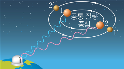 [참고 자료1] (왼쪽) 일반적으로 생각하는 공전 궤도, (오른쪽) 실제 공통 질량 중심을 기준으로 공전하는 궤도, 이러한 원인은 간단히 설명하면 뉴턴의 만유인력 법칙을 통해 알 수 있습니다. 모든 물체는 당기는 힘 ‘인력’이 존재하게 되므로 행성계에 대해 모 항성이 행성을 당기는 힘도 존재하지만 행성도 모 항성을 당기는 힘이 존재하기 때문에 공통 질량 중심이 생기게 됩니다. 이러한 공통 질량 중심에 의한 중심별의 시선 속도 변화는 두 천체의 물리적 성질(천체의 질량, 궤도 반경)에 따라 달라집니다. (1) 도플러 효과