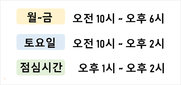 월 – 금 : 오전10시 ~ 오후6시 (점심시간 오후1시 ~ 오후2시) 토요일 : 오전10시 ~ 오후2시 일요일 / 공휴일 : 휴진