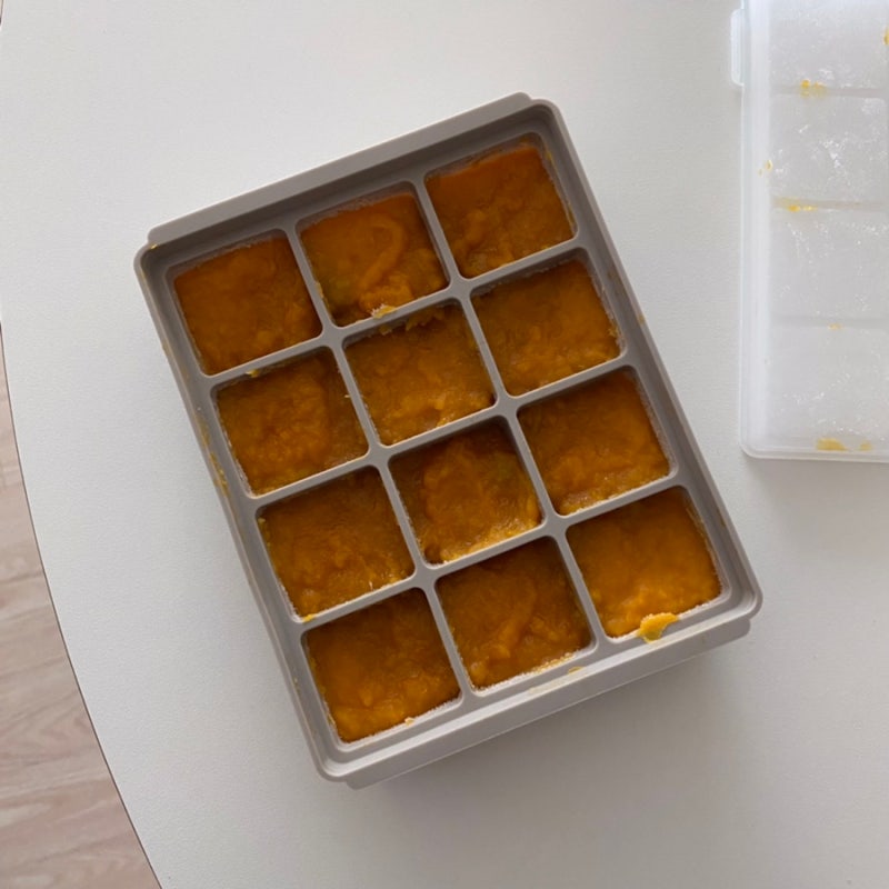 25분간 쪄서 딱딱해진 고구마를 이유식 용기 실리콘 큐브에 그램 수에 맞춰 넣으면 되기 때문에 매우 간단합니다! 스티커로 만든 날짜의 그램 수까지 표기하면 완성입니다.
