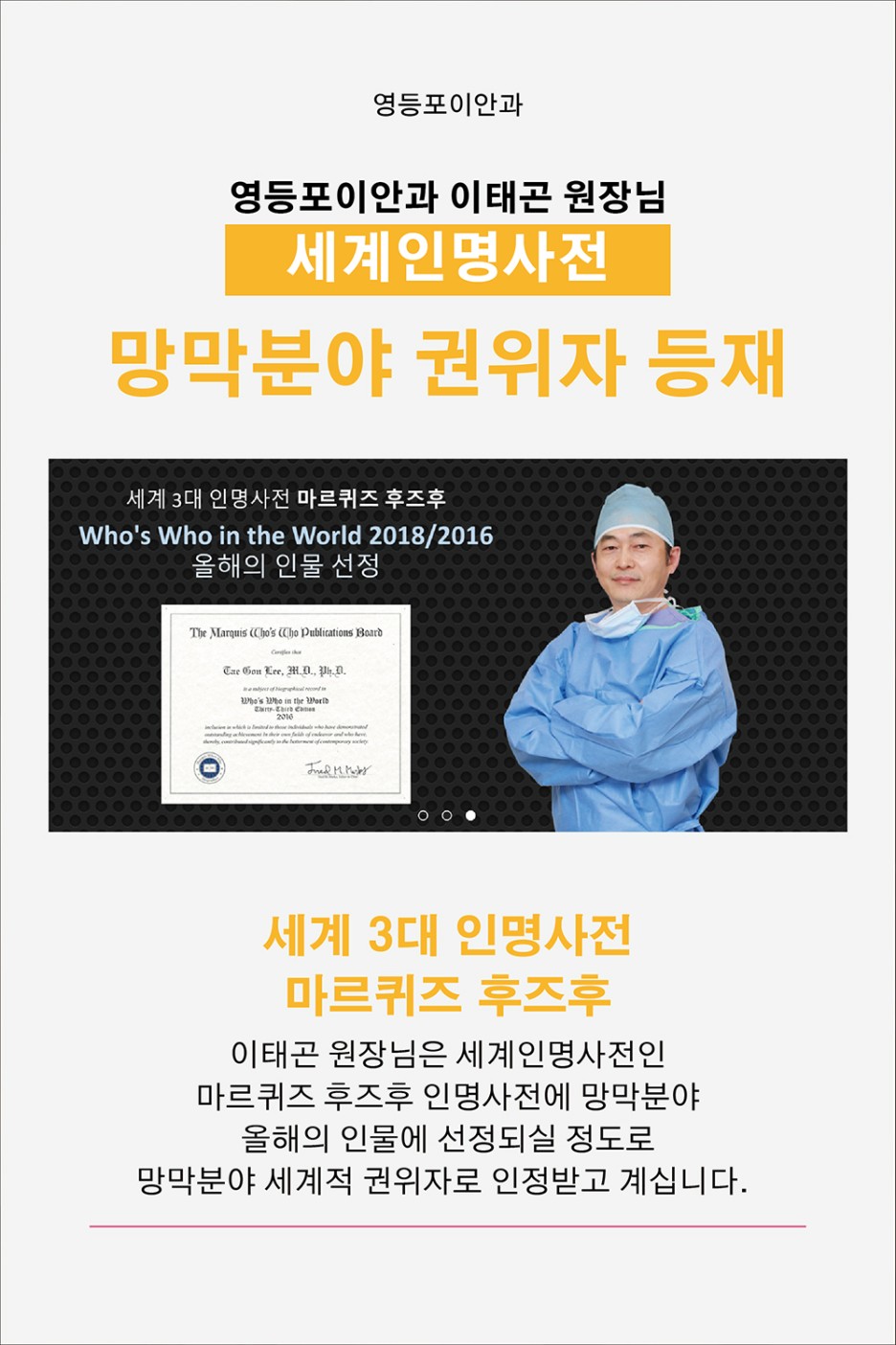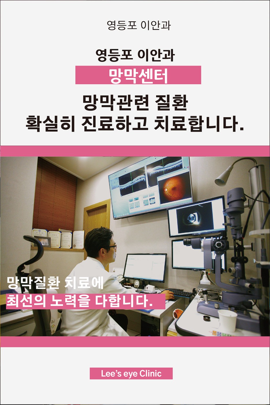 가장 좋은 치료는 정기 검진과 조기 진단 녹내장은 쉽게 낫는 병이 아닙니다. 그러나 치료하지 않고 방치하면 실명까지 이르는 무서운 질병입니다. 그러므로 적절한 치료법과 꾸준한 안압검사, 시야검사, 시신경검사 등을 정기적으로 실시하는 것이 좋습니다. 평소 녹내장 증상을 느끼셨거나 검사가 필요하다고 생각하시는 분은 영등포 이안과를 내원하여 검사와 진료를 받으시기 바랍니다.