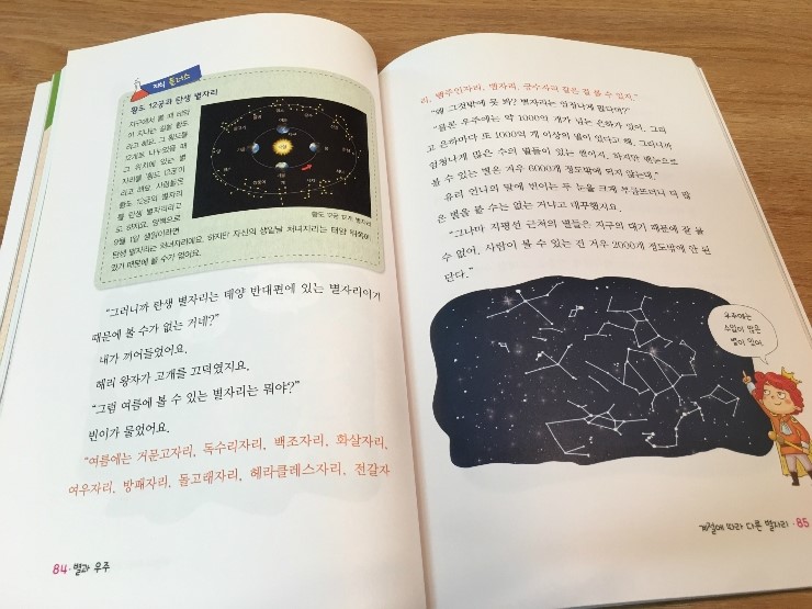 별(항성):스스로 빛을 낼 수 있는 천체, 모든 별은 중심 핵에서 핵 융합 반응을 일으키면서 에너지를 방출, 태양계 속에서 별은 태양을 입은 채 1. 별의 밝기(등급 숫자가 작을수록 밝은 별, 1등급 차이가 2.5배의 밝기 차 ① 겉보기 등급:지구에서 육안으로 보았던 별의 밝기, 작을수록 밝게 보이는 별 ② 절대 등급:별이 관측자로부터 10pc의 거리에 있다고 가정했을 때의 밝기, 작을수록 실제로 밝은 별 2. 별자리 ① 북두칠성: 큰 곰 자리의 일부, 북극성을 찾는 데 도움을 줌 ② 작은 곰 자리:북극성이 있는 별자리 ③의 카시오페이아 자리:가을에 은하수의 가까이 볼 수 있는 별자리, 북극성 찾기에 이바지 ④ 북극성: 작은 곰 자리에서 가장 밝은 별, 지구 자전축의 북쪽 방향 연장선과 거의 일치하고 방향을 찾을 때 사용함과 눈으로 보면 북극성은 밤하늘에서 움직이지 않게 보이는 것-지구가 자전하는데 다른의 별이 북극성을 중심으로 도는 것처럼 보이자 오랜 세월에 걸쳐 자전축이 회전(세차운동)하기 때문에 시대에 따라 북극성도 변하고 cf. 세차운동 : 자전하는 물체의 회전축이 원을 그리며 움직이는 현상 – 북극성 찾는 법 : 북두칠성 국자 모양의 마지막 부분 길이의 약 5배 떨어진 곳을 관찰 / 카시오페아자리 w자 모양의 양쪽 변을 이은 연장선이 만나는 것으로 가운데 별까지의 간격으로 약 5배 떨어진 곳 관찰 cf. 별자리를 이루는 별의 거리는 실제로 매우 멀리 있는 것