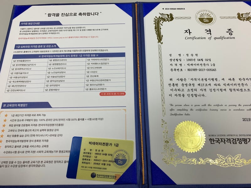 나는 정말 솔직하게 수업을 열심히 들었는데, 나는 아무래도 통계를 공부하고 연구한 사람인지 좀 겹치는 부분도 있어서 쉽게 이해가 됐고 교수님 말씀을 하나도 빼고 듣지 않으려고 엄청 필기를 한 것 같아요.나는 정말 솔직하게 수업을 열심히 들었는데, 나는 아무래도 통계를 공부하고 연구한 사람인지 좀 겹치는 부분도 있어서 쉽게 이해가 됐고 교수님 말씀을 하나도 빼고 듣지 않으려고 엄청 필기를 한 것 같아요.귀로만 들으면 무슨 말을 하는지 모를 때가 있는데 적어도 내가 내 입으로 다시 읽어보면 아, 그랬구나~ 싶을 때가 있기 때문에 혹시 경험을 전혀 하지 않았다거나 경영학 수업을 듣지 않은 사람이라면 공부하기 힘들지 않을까라는 생각이 들었습니다.물론 암기를 통해서 자격증을 딸 수도 있지만 이해가 더 잘 되면 머리에 남는 일이 많을 테니까요. 그리고 시험 난이도가 높을까 봐 시간이 부족할까 봐 시험 예상 문제를 저는 한 5번은 푼 것 같아요.몇 문제가 나올지 모르고 해설집도 제가 다시 만들어서 공부 시간이 걸렸어요.실제로 시험을 보러 갔더니 문제 수는 20문항에 한 문제당 5점입니다.시험시간은 60분입니다^^! 미리 알면 편하겠죠.저는 시험공부를 너무 많이 해서 그런지 모르는 문제는 나오지 않았어요.(웃음)그런데 하나 틀렸다니까.;; 뭐가 어디가 잘못됐지?솔직히 왜 하나 틀렸는지 이해가 안 돼요.어디가 잘못되었는지 정말 알고 싶어요. 흐흐흐흐 근데 모르겠네요.그래도 A+점수로 합격해서 기분은 좋아요. 그럼 열심히 했는데 안 나왔으면 나한테 실망했을 거야.그런데 하나 틀렸다니까.;; 뭐가 어디가 잘못됐지?솔직히 왜 하나 틀렸는지 이해가 안 돼요.어디가 잘못되었는지 정말 알고 싶어요. 흐흐흐흐 근데 모르겠네요.그래도 A+점수로 합격해서 기분은 좋아요. 그럼 열심히 했는데 안 나왔으면 나한테 실망했을 거야.그런데 하나 틀렸다니까.;; 뭐가 어디가 잘못됐지?솔직히 왜 하나 틀렸는지 이해가 안 돼요.어디가 잘못되었는지 정말 알고 싶어요. 흐흐흐흐 근데 모르겠네요.그래도 A+점수로 합격해서 기분은 좋아요. 그럼 열심히 했는데 안 나왔으면 나한테 실망했을 거야.수료증, 자격증이 나오는데, 자격증은 상장형과 카드 형태가 나오고 갱신할 필요 없이 자격증이라~ 좋겠어요!오랫만에 이력서에 추가하게 되서 기쁩니다. Loading… player_likesound_mutesound_mutesound_volume2sound_volume3[x]Player Size:0 x 0Current Resolution:0PMax Abr Resolution:0PProtocol:hlsCurrent Bandwidth:Average Bandwidth:Buffer Health:Frame Drop Rate:0/0도움말라 이 감각 Video Statistic Version 4.29.4(HLS)Build Date(2022/8/31)NAVER Corp. 동영상 인코딩 중입니다.5분 이상 걸리는 경우가 있고, 영상의 길이에 의해서 소요 시간은 다릅니다. [최종 2편]빅 데이터 전문가 1급 자격증을 취득했습니다! 재생 수 60topleft rightbottom마우스를 드래그 하세요.360°Video도움말 MULTI TRACK다중 트랙의 트랙별 영상은 오른쪽의 관련 영상으로 볼 수 있습니다.선거 광고 안내 뮤트 00:00| 00:12화질 선택 옵션 자동 144p270p360p480p720pHD화질 전 화면 00:0000:0500:0700:09광고 정보를 더 보초 후, SKIP초 후 재생 SKIP광고 후에 이어집니다.SNS공유 소스 코드 Band Twitter Facebook Blog CafeURL주소 카피 HTML소스 544x306740x416936x5261280x720카피 Flash음성 지원으로 Object코드를 확산시키는 기능은 더 이상 지원되지 않습니다.도움말 플레이어 URL복사 레이어 감는다[최종 2편]빅 데이터 전문가 1급 자격을 취득했습니다!https://www.klli.kr:4436/한국직업능력교육협회: 심리상담사자격증, 병원코디네이터자격증, 바리스타 무료교육 국가지정기관 한국직업능력개발원 정식등록자격증! 한국직업능력교육협회 1급 심화전문자격증 www.klli.kr”본 자격증은 한국직업능력교육협회의 협찬을 받아 직접 공부하고 시험을 보고 자격증을 취득하여 글을 올리게 됨을 알려드립니다! “#한국직업능력교육협회 #빅데이터 자격증 1급”