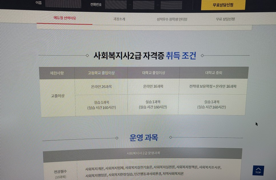 하지만 제가 생각했던 것만큼 쉽지는 않았어요.취득조건 때문이었는데 저는 다른 자격증처럼 시험에 합격하면 사회복지자격증이 나올 줄 알았어요. 하지만 사회복지사 2급의 경우는 대학처럼 특정 학점을 이수해야 취득할 수 있었습니다.