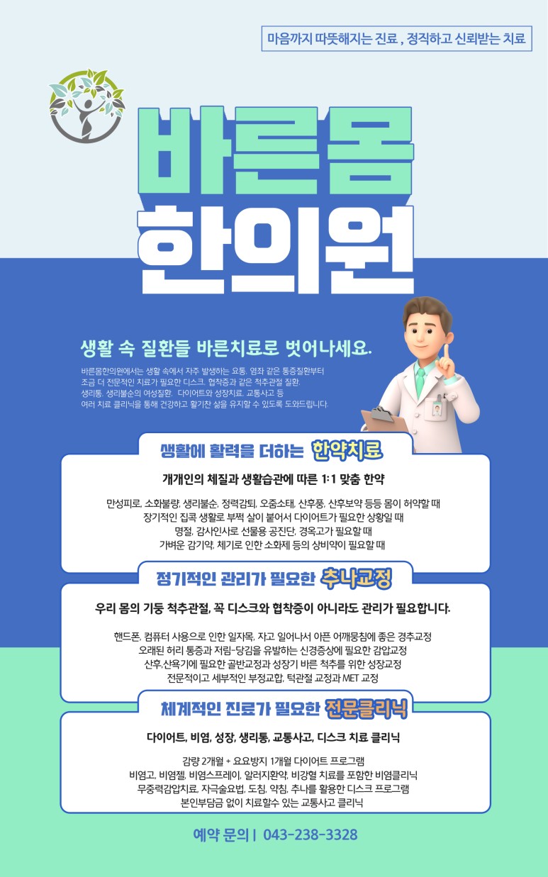 안녕하세요 마음까지 따뜻해지는 진료 정직하고 신뢰받는 치료 청주바른체한의원 양 원장입니다. 한의원 blog.naver.com