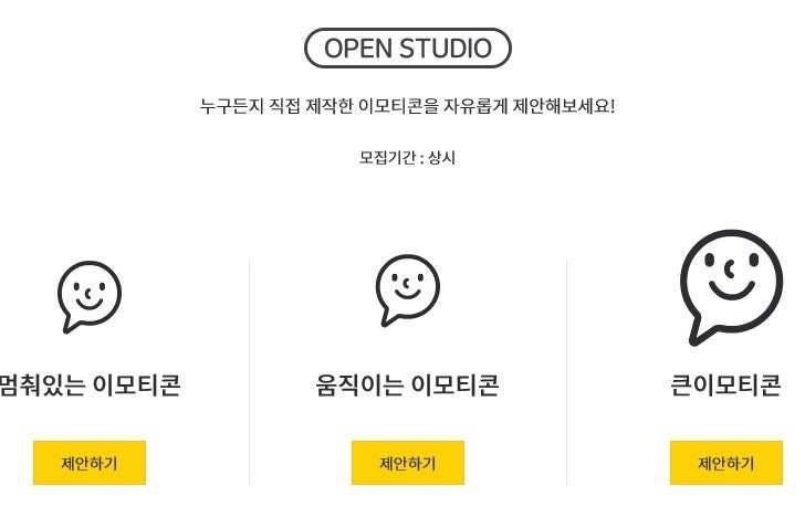 提案の前に確認事項 1. 会話の中で書かなくてはなりません 2. 誰が、いつ、どのように書くかを先に決めて作れば少しも簡単でターゲットを握ることもできます 3. 止まっているイコンならメッセージ伝達を明確に!動くイコンなら動きに活用してください4. モバイルでよく見えなければなりません(360*360)5. 新しくて個性的に(創作性や差別性は必要でしょう?)6. 著作権や倫理指針、他人のものとあまりにも似ていたり重すぎたりするとどうでもよくありません!