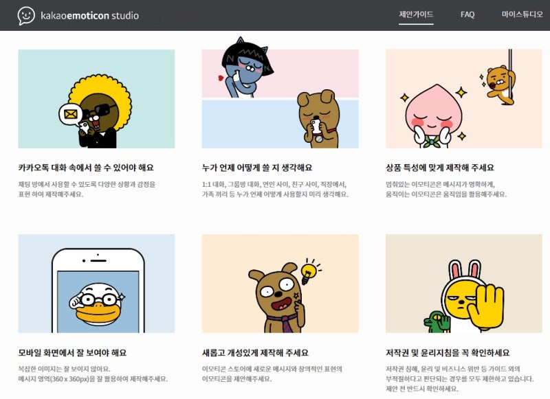 画像出典、カカオ絵文字スタジオホームページこの前キャラクター登録を終えてからカカオトーク絵文字作りに「挑戦」しています:)これも今年は一度やってみないと関心を持って見守ってなかったので..一度やってみたい分野でもあったんですよ~最近、人々がすることが第2のシューイプに対して関心も高くなったし、うまくいけばいいのですが、^-^するからといってみんなうまくいくわけではないので;;あまり期待しないでほしいです!!