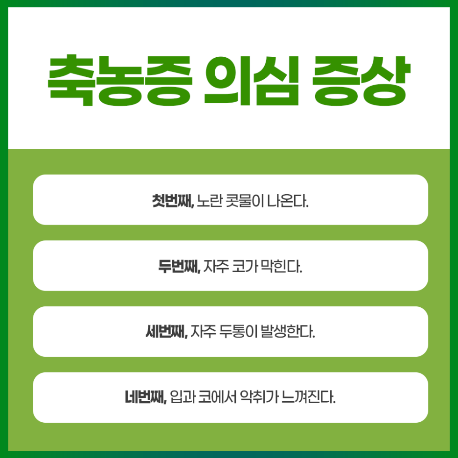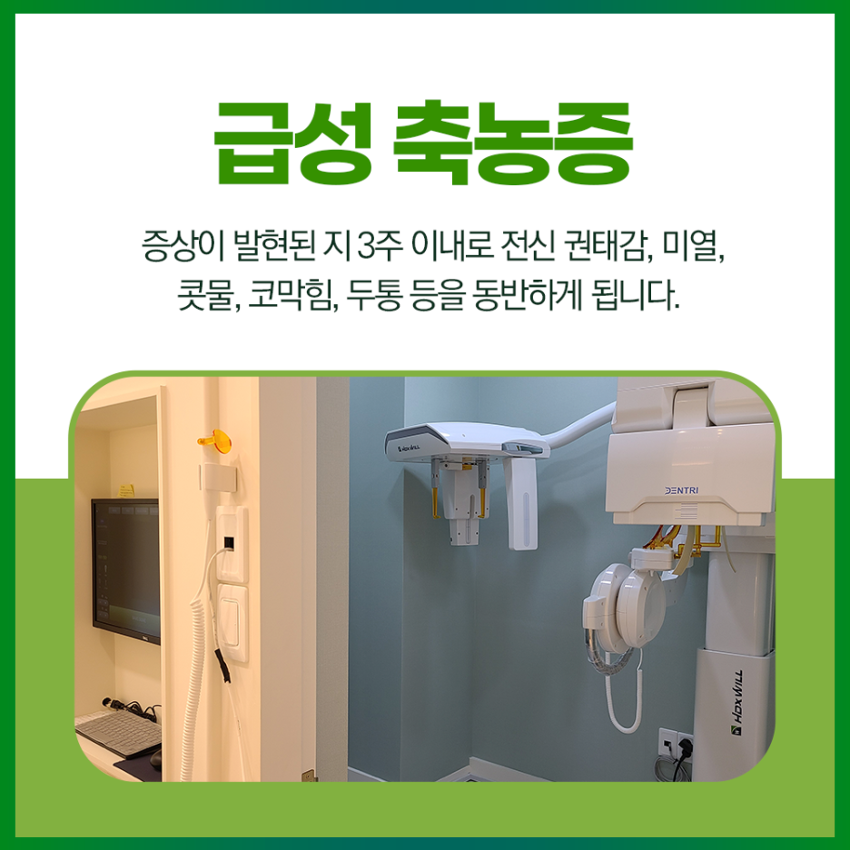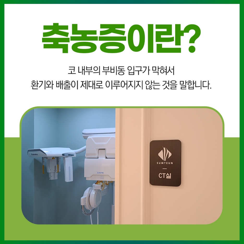 안녕하세요 대구숲톤 이비인후과 입니다.따뜻한 여름에는 감기와 같은 환절기 환자 수가 많지 않습니다.다만 냉방기 과다 사용으로 인한 실내외 급격한 온도 차이로 냉방병, 컨디션 불량이 나타나기도 하는데요.만약 이런 부분이라면 일정 시간 휴식을 취하거나 면역력 강화, 약물치료 등으로도 충분히 증상을 호전시킬 수 있습니다.하지만 계속 이상 징후가 나타나면 문제가 되는 근본적인 원인을 개선해야 합니다.오늘 저희 병원에서는 많은 분들이 놓치기 쉬운 축농증이라는 질환에 대해 알아보겠습니다.