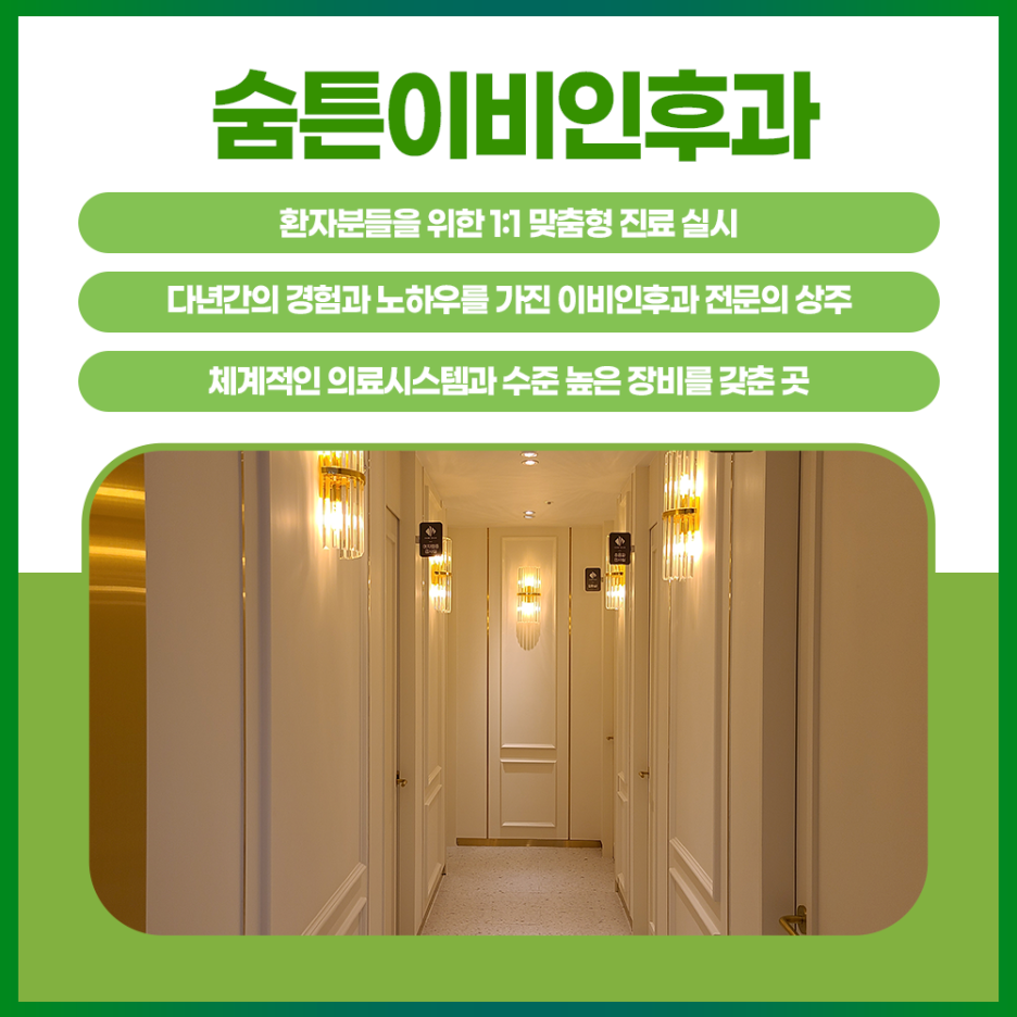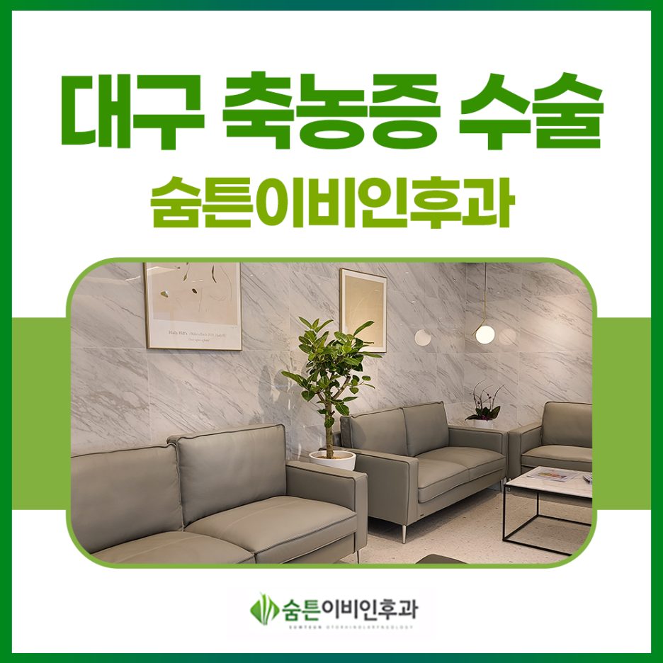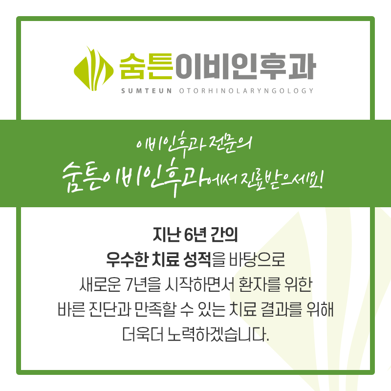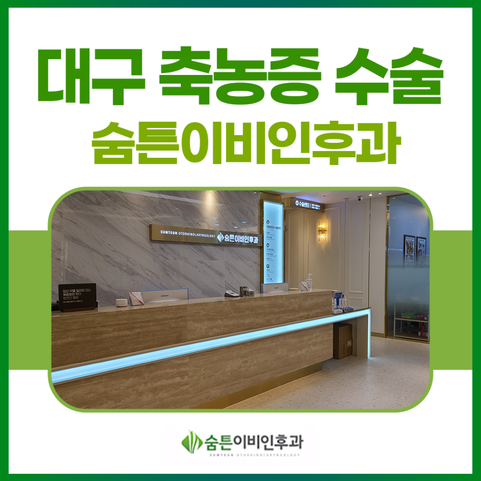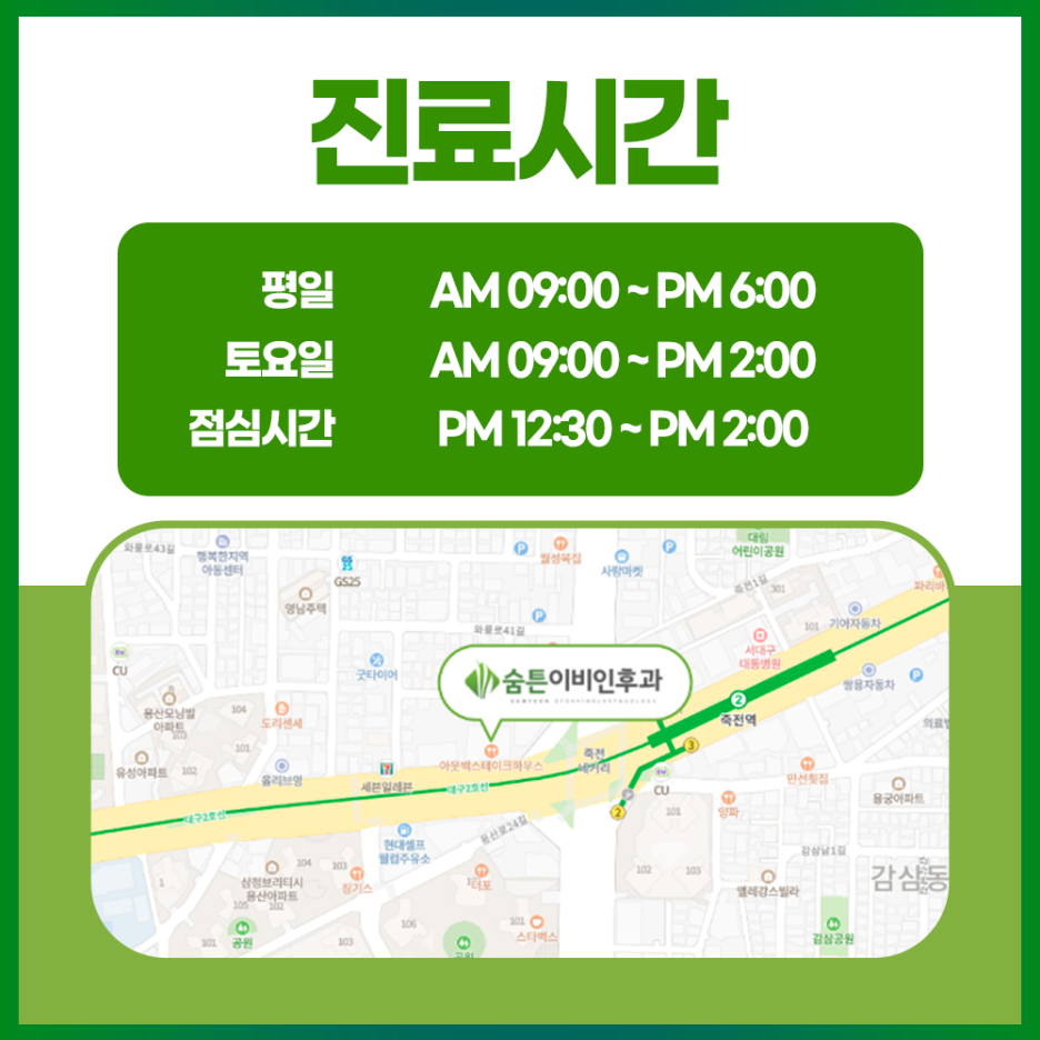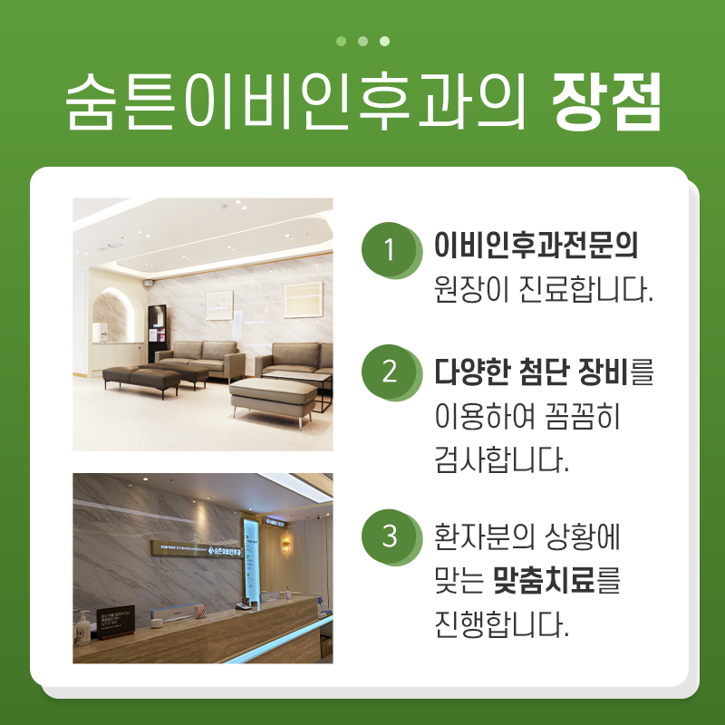 대구 숨통이비인후과는 풍부한 임상경험과 수준 높은 의료기기로 많은 환자들의 쾌적한 일상을 되찾고 있습니다.노란 코, 고통스러운 호흡 등으로 삶의 질을 떨어뜨리는 문제로 힘든 일상을 보내고 있다면 저희 병원을 방문하십시오.