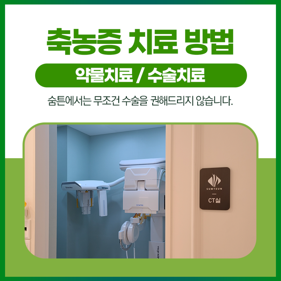 만약 불가피하게 축농증 수술이 이루어져야 한다면 개인 상태에 따른 적절한 방향으로 계획을 세워야 합니다.저희 병원에서는 콧속의 구조적인 문제를 해결하는 부비동 내시경 시술을 통해 환자의 편안한 숨을 되찾고 있습니다.앞서 말씀드렸듯이 부비동이라는 빈 공간에서 배출이 원활하게 이루어지지 않으면 그 안에 염증뿐만 아니라 물집, 곰팡이균 등도 쌓이게 됩니다.따라서 해당 교정술에서는 부비강을 열어 분비물을 모두 제거하는 과정을 선행합니다.그리고 내시경으로 문제가 되는 구조적인 부분을 확장하여 병증을 해결합니다.재발 가능성이 높은 원인을 제거할 수 있다는 큰 장점이 있고 환자의 만족도가 매우 높은 교정술이라고 할 수 있습니다.또한 30분 정도의 짧은 시간이 걸리기 때문에 시간적으로나 신체적인 부담도 적어요.다만 이후 2주 이내까지는 코막힘이나 약간의 출혈이 발생할 수 있으며, 7일 후부터는 소독과 코세척이 이뤄져야 빠른 회복에 도움이 됩니다.
