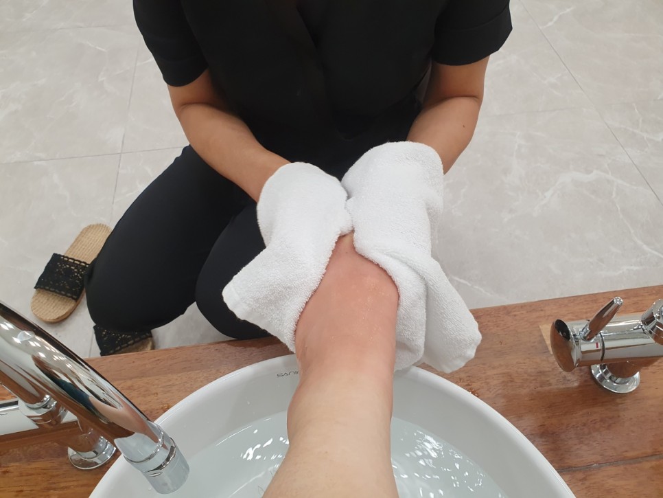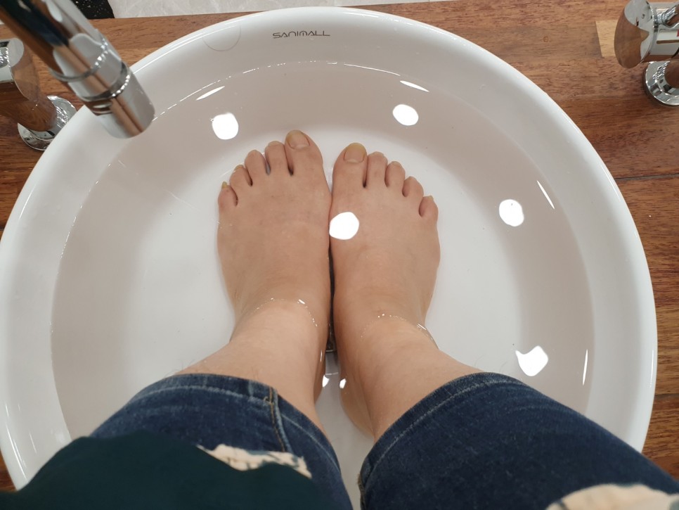 원장은 케어 전에 몸의 혈액 순환을 촉진시키는 따뜻한 족욕부터 시작하네요. 동남아 여행 이후 이런 서비스는 처음이야~
