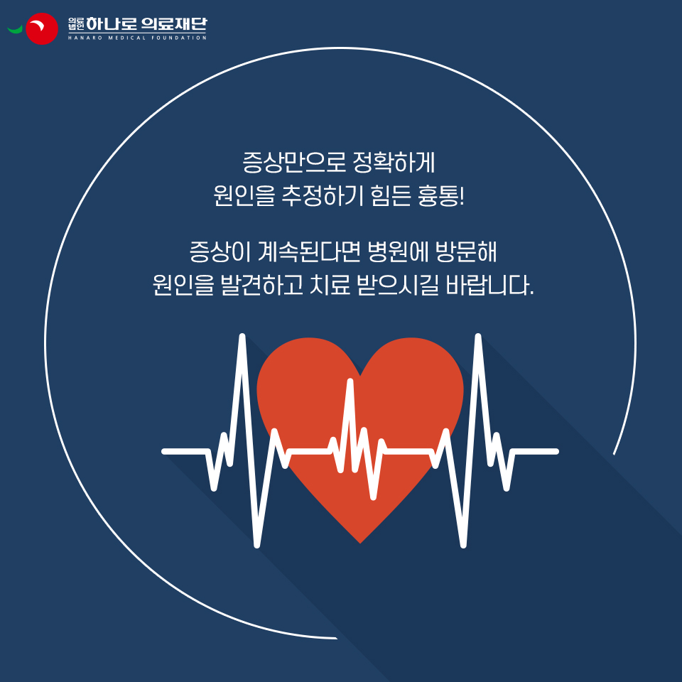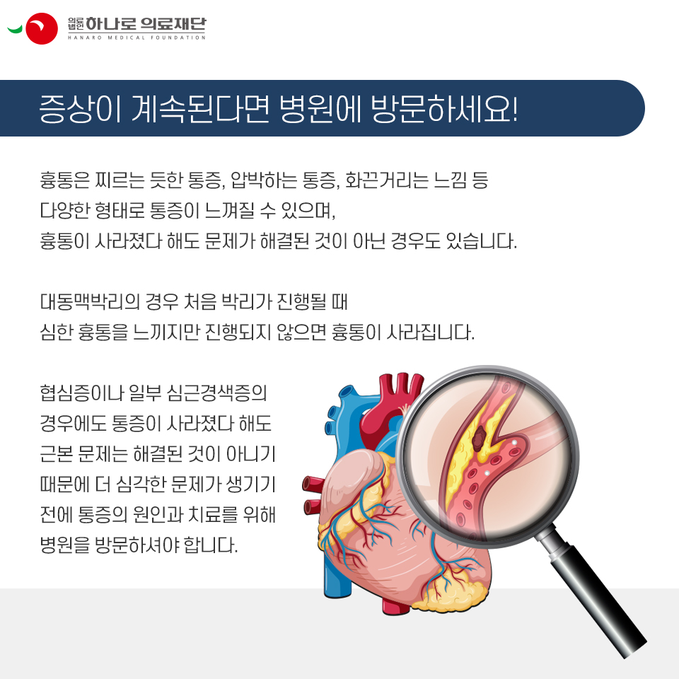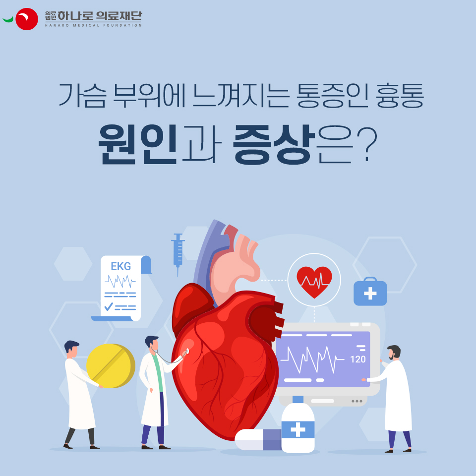 증상만으로 정확하게 원인을 추정할 수 없는 흉통! 증상이 지속될 것 같다면 병원에서 원인을 찾아 치료를 받으시기 바랍니다. 지금까지 하나로의료재단이었습니다.