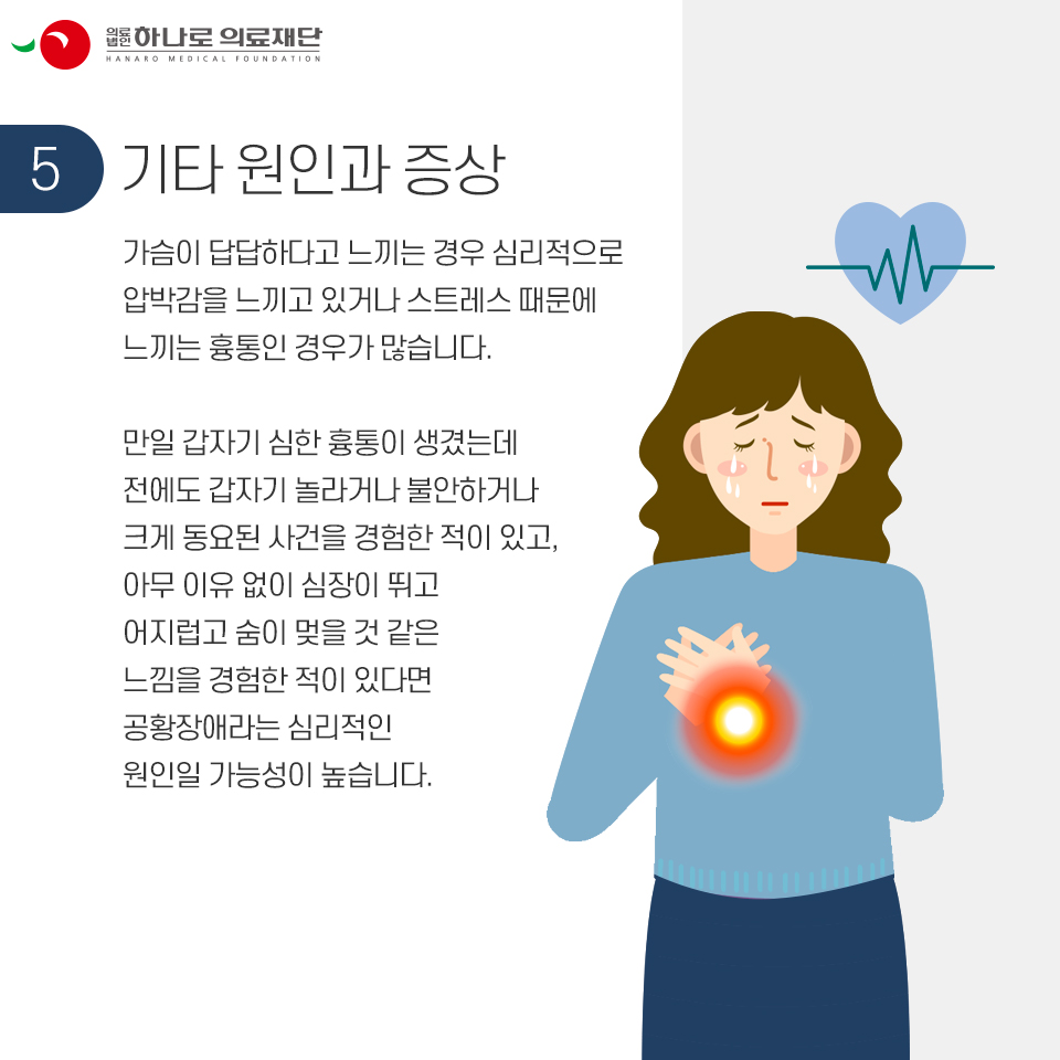 가슴이 답답하다고 느끼는 경우 심리적으로 압박감을 느끼고 있거나 스트레스로 느끼는 흉통일 때가 많습니다. 만에 하나 갑자기 심한 흉통이 생겼는데 전에도 깜짝 놀라거나 불안하거나 크게 동요한 사건을 경험한 적이 있고, 아무런 이유 없이 심장이 두근거리고 어지러운 느낌을 경험한 적이 있다면 공황장애라는 심리적 원인일 가능성이 높습니다.