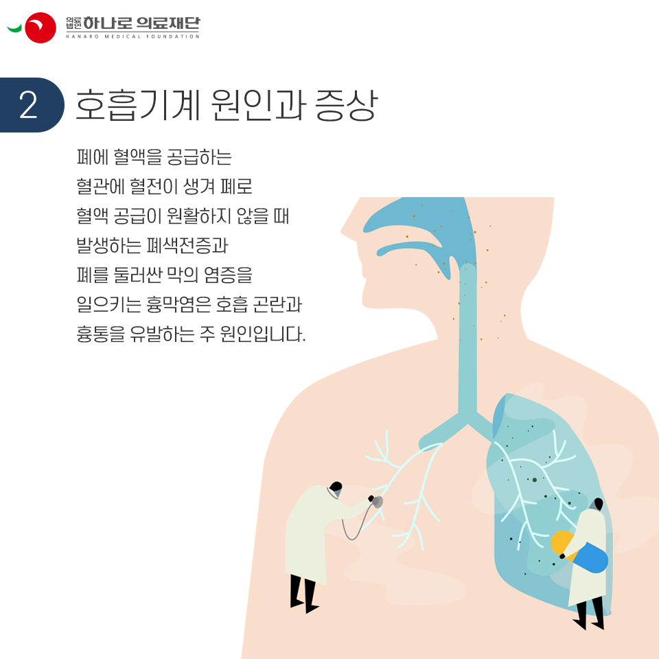 폐에 혈액을 공급하는 혈관에 혈전이 생겨 폐에 혈액 공급이 잘 안 될 경우 발생하는 폐색전증과 폐를 둘러싼 막의 염증을 일으키는 흉막염은 호흡곤란과 가슴 통증을 유발하는 주요 원인입니다.흉막염의 경우 숨을 마시거나 기침을 할 때 가슴 통증이 더 심각해지는 경향을 보이고 있습니다.