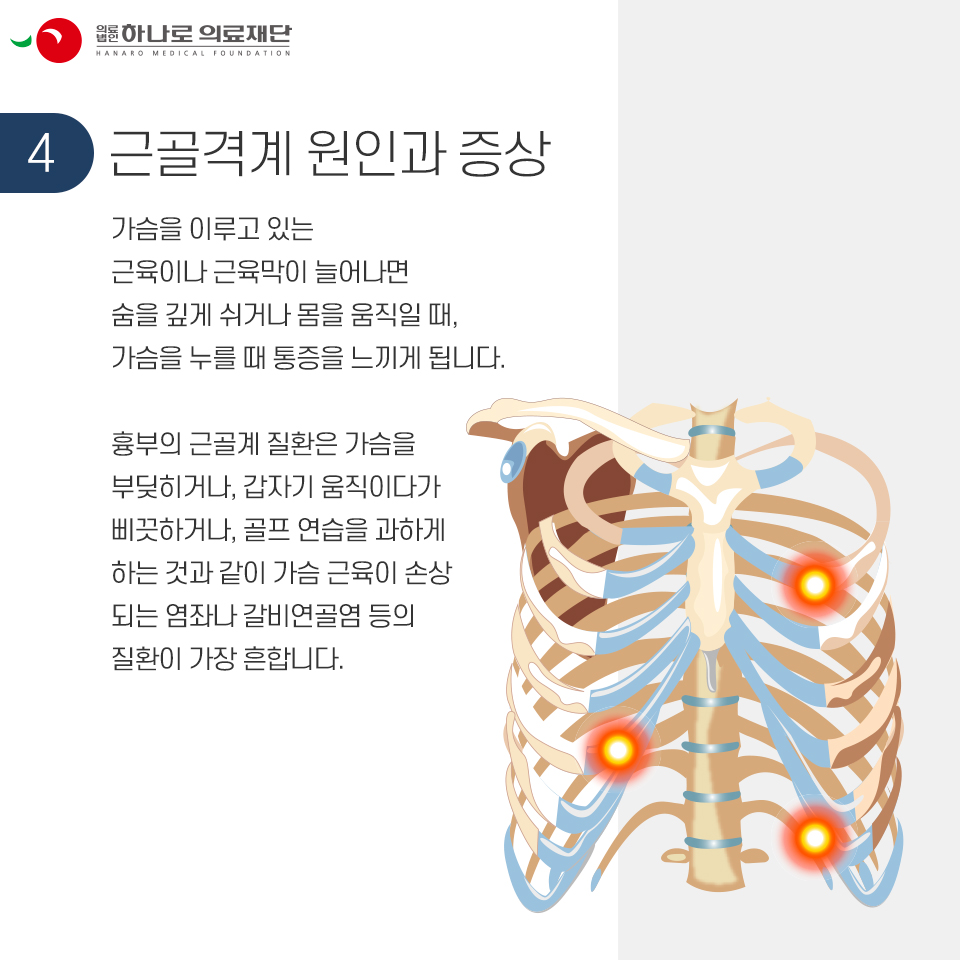 흉통을 일으키는 가장 일반적인 원인은 근골격계 질환입니다. 가슴을 이루고 있는 근육이나 근육막이 증가하면 숨을 깊게 들이쉬거나 몸을 움직일 때, 가슴을 누를 때 통증을 느끼게 됩니다. 흉부 근골계 질환은 가슴을 부딪치거나 갑자기 움직이거나 골프 연습을 너무 많이 하는 것처럼 가슴 근육이 손상되는 염좌나 늑골염 등의 질환이 가장 일반적입니다. 교통사고, 미끄러져 넘어지는 등의 큰 충격으로 갈비뼈에 금이 가거나 부러져 아플 수도 있습니다.