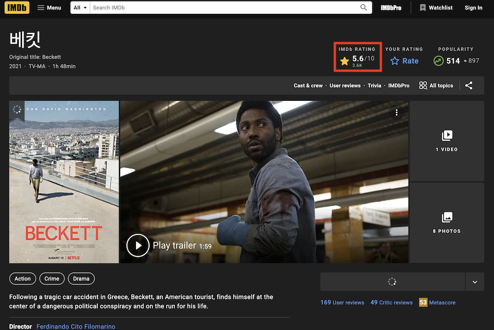 우선 영화 베켓의 평점부터 보자. IMDb 기준으로 8월 15일 현재 10점 만점에 5, 6점을 기록 중이다. 참가자는 3,600k.좀 낮은 편인가 봐.