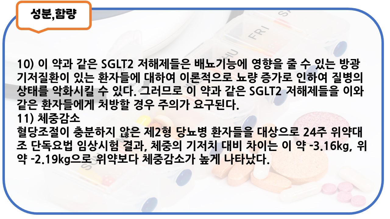 주성분:다파구립로진프로판디올수화물 6.15mg다파그립로진 프로판디올 수화물이란?- 경구용 당뇨병 치료제(만성심부전, 만성콩팥병 치료에도 사용됨) 신장에서 포도당이 재흡수되지 않도록 소변으로 포도당을 배출시켜 혈당 상승을 억제하는 효능이 있다.첨가제 : 무수유당, 미결정 셀룰로오스, 스테알산 마그네슘, 오파드라이l 황색(85F92582), 이산화규소, 크로스포비돈”효능 효과포자가정 10mg, 5mg은 혈당이 충분히 조절되지 않는 2형 당뇨병 환자의 혈당 조절을 향상시키기 위해 식이요법이나 운동요법 보조제로 투여하게 되며 단독요법 및 병용요법으로 이루어집니다.또한 좌심실 수축기능이 저하된 만성심부전 환자에서 심혈관질환으로 인한 사망 및 심부전으로 인한 입원 위험이 감소하는 효과도 있고 만성심부전으로 투여될 수도 있으며 만성콩팥병 환자에서 추정 사구체 여과율의 지속적인 감소, 말기콩팥병에 도달, 심혈관질환으로 인한 사망 및 신장관련 사망위험 감소의 효과로 만성콩팥병에도 투여할 수 있습니다.미합중국10 미합중국용량 용법당뇨병 환자 제2형 당뇨병 환자 단독요법 및 추가 병용요법으로는 1일 1회 10mg이며, 이 약을 인슐린 또는 설포닐우레아와 같은 인슐린 분비 촉진제와 병용하여 사용하는 경우에는 저혈당 위험률을 낮추기 위해 더 낮은 용량의 인슐린 또는 인슐린 분비 촉진제를 생각할 수 있습니다~! (이전 당뇨병 약물치료를 받은 경험이 없는 경우 메트포르민과의 병용 투여 시 초기 권장용량 1일 1회 5mg 또는 1회 10mg으로 투여를 시작합니다) 민상심부전 및 만성콩팥병 환자의 경우 1회 10mg을 복용합니다.특히 당뇨병 약 복용 시간은 음식 섭취에 관계없이 하루 1회, 하루 중 언제든지 경구 투여하면 됩니다. (물과 함께 통째로 삼킴)부작용.이 약을 복용 중 나타나는 부작용 증상은 저혈당, 외음부 질염, 요로감염, 어지러움, 요통, 배뇨통, 다뇨, 이상지질혈증 등이 가장 많고 변비, 진균감염, 구강건조, 야간뇨, 구갈, 체중감소, 외음부/생식기 가려움증 등의 증상도 드물게 나타날 수 있습니다.이러한 증상이 지속되거나 피로감, 근육통, 호흡곤란, 체온저하, 저혈압 등의 증상이 나타나면 전문의와 상의하여 적절한 조치를 취해야 합니다~!주의사항이 약을 복용 중 인슐린이나 설포닐우레아와 같은 인슐린 분비 촉진제를 투여하면 저혈당 위험률이 높아지는 만큼 용량을 줄이는 등 전문의가 올바른 판단을 할 수 있도록 본인이 약을 복용하고 있음을 항상 알리는 것이 중요합니다.이외에도 아래 표에서 이 약을 투여해서는 안 되는 경우와 신중하게 투여해야 하는 경우에 해당하는지 확인해주세요~!이 약을 투여해서는 안 되는 경우 이 약의 주성분이나 첨가제에 대하여 과민반응 병력이 있는 환자 제1형 당뇨병 또는 당뇨병성 케톤산증 환자 이 약은 유당 무수물을 함유하므로 갈락토스 불내성, Lapp 유당분해효소 결핍증 또는 포도당-갈락토스 흡수장애 등의 유전적이므로 문제가 있는 환자에게는 투여해서는 안 된다.투석 중인 환자이 약을 투여해서는 안 되는 경우 이 약의 주성분이나 첨가제에 대하여 과민반응 병력이 있는 환자 제1형 당뇨병 또는 당뇨병성 케톤산증 환자 이 약은 유당 무수물을 함유하므로 갈락토스 불내성, Lapp 유당분해효소 결핍증 또는 포도당-갈락토스 흡수장애 등의 유전적이므로 문제가 있는 환자에게는 투여해서는 안 된다.투석 중인 환자신중하게 투여해야 할 경우 체액량 감소 및 신장 기능 장애가 있는 환자에게 투여신중하게 투여해야 할 경우 체액량 감소 및 신장 기능 장애가 있는 환자에게 투여신중하게 투여해야 할 경우 체액량 감소 및 신장 기능 장애가 있는 환자에게 투여임산부 및 수유 안부에 대한 투여 생쥐에 대한 연구 결과를 참고하면 사람의 임신 2기 3기에 해당하는 기간에 신장 발달에 대한 독성을 나타낸 만큼 임신한 여성과 임신 가능성이 있는 여자는 이 약을 투여해서는 안 되며, 수유부도 이 약을 투여하는 동안 모유 수유를 중단해야 합니다.특히 신장 질환의 환자나 그 병력이 있는 경우는 반드시 전문의에게 알려서 이 약을 복용해야 하며 현기증과 피로감 등의 저혈당 증상이 나타난 경우는, 즉시 당분이 있는 음식을 섭취하세요~!임산부 및 수유부에 대한 투여 레트에 대한 연구 결과를 참고하면 사람의 임신 2기, 3기에 해당하는 기간에 신장 발달에 대한 독성을 보인 만큼 임신한 여성이나 임신 가능성이 있는 여성은 이 약을 투여해서는 안 되며 수유부 또한 이 약을 투여하는 동안 모유 수유를 중단해야 합니다.특히 신장질환 환자나 그 병력이 있다면 반드시 전문의에게 알려 이 약을 복용해야 하며 어지러움이나 피로감 등 저혈당 증상이 나타난다면 즉시 당분이 있는 음식을 섭취하세요~!임산부 및 수유부에 대한 투여 레트에 대한 연구 결과를 참고하면 사람의 임신 2기, 3기에 해당하는 기간에 신장 발달에 대한 독성을 보인 만큼 임신한 여성이나 임신 가능성이 있는 여성은 이 약을 투여해서는 안 되며 수유부 또한 이 약을 투여하는 동안 모유 수유를 중단해야 합니다.특히 신장질환 환자나 그 병력이 있다면 반드시 전문의