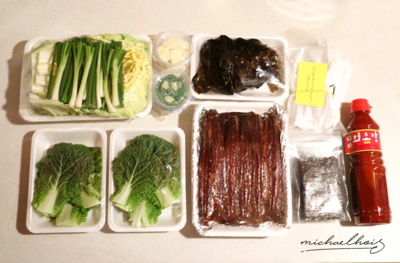 촉촉한 생미역 한다발과 배추곱창김, 쪽파, 오이고추, 편마늘까지 포항과 메기를 먹기에 안성맞춤인 조합으로 든든히 들어 있다.