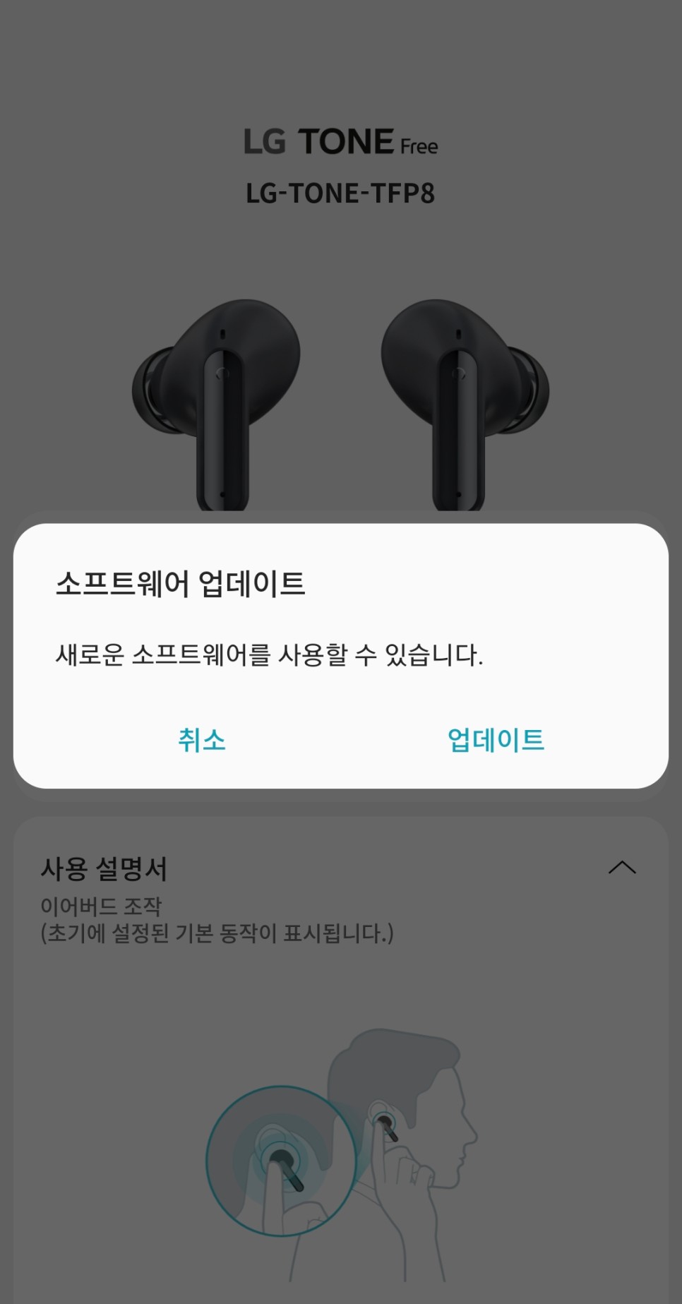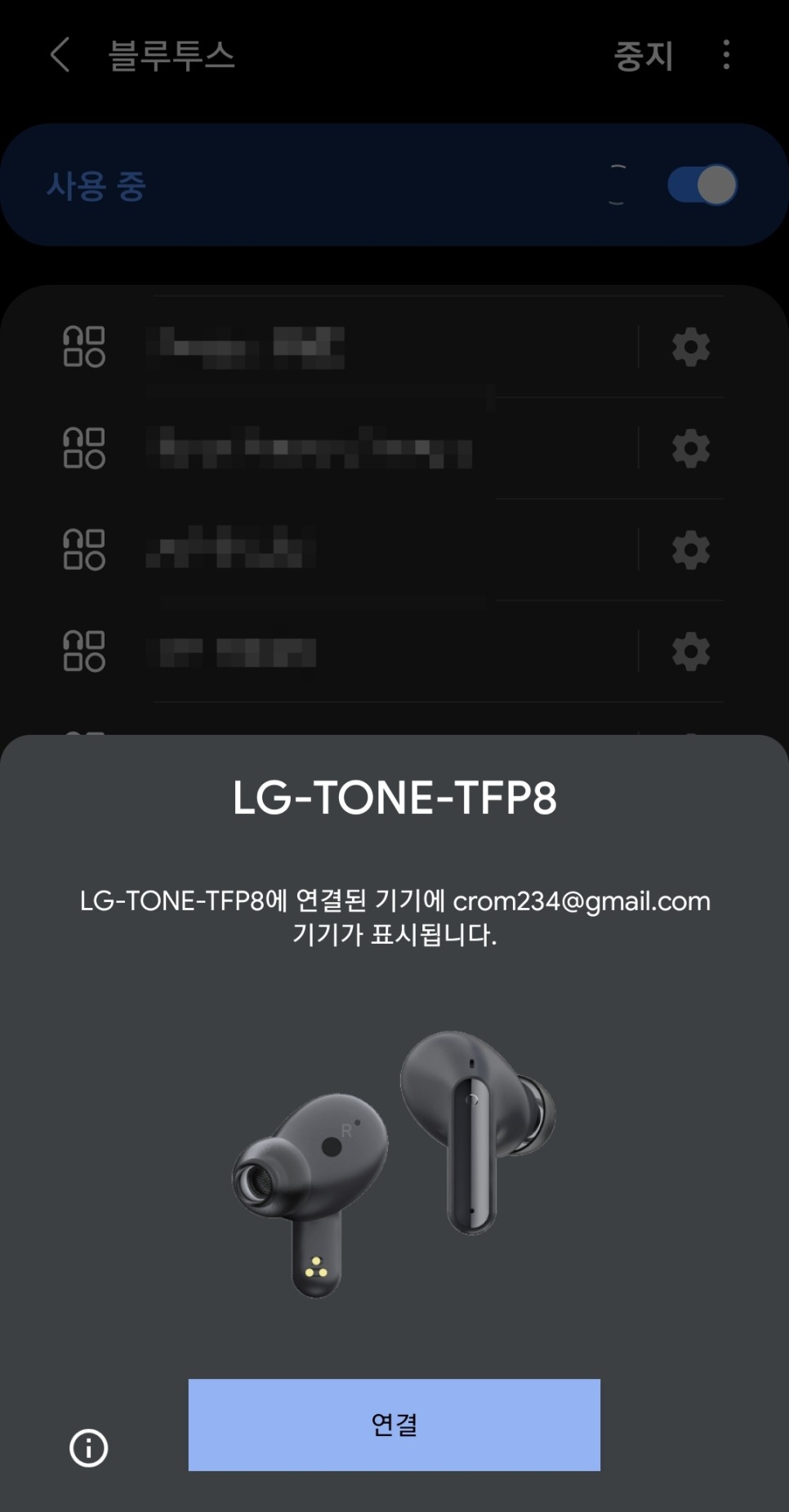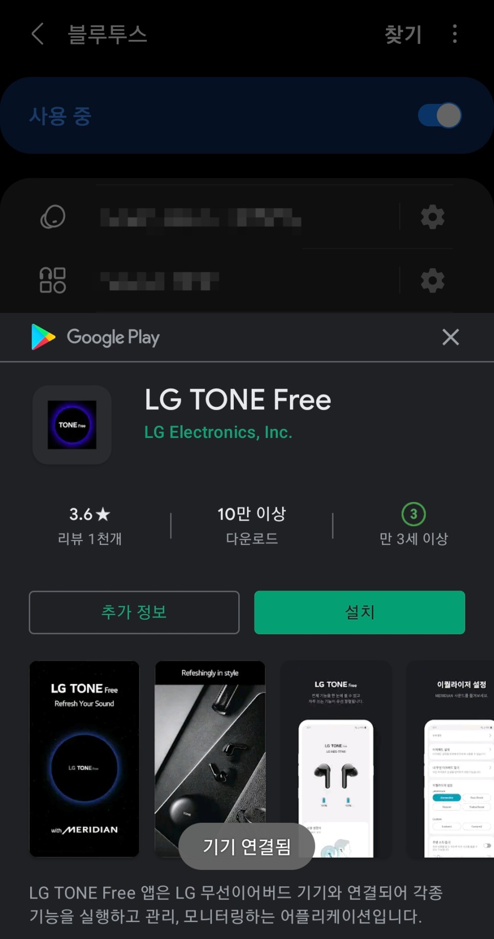 간편한 연결 연결하고자 하는 기기의 블루투스 기능을 활성화시켜 검색을 하면 이렇게 LG 톤프리 TFP8이 검색되고 앱까지 내려받을 수 있도록 자동 연결된다.