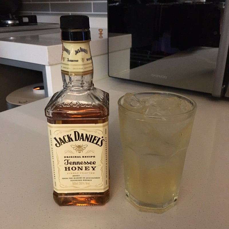 잭콕이 만든 얼음을 가득 부은 잔에 잭다니엘 허니를 100ml 정도 따릅니다. 하이볼 초보자분들은 위스키 양을 더 줄이면 되고 반대로 이 맛을 아시는 분들은 위스키 양을 더 늘리십시오.