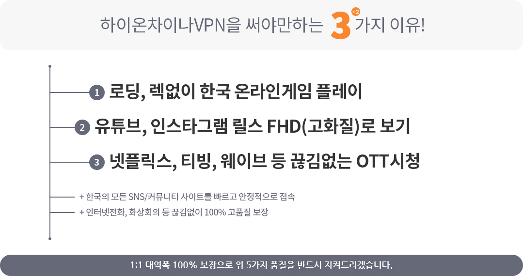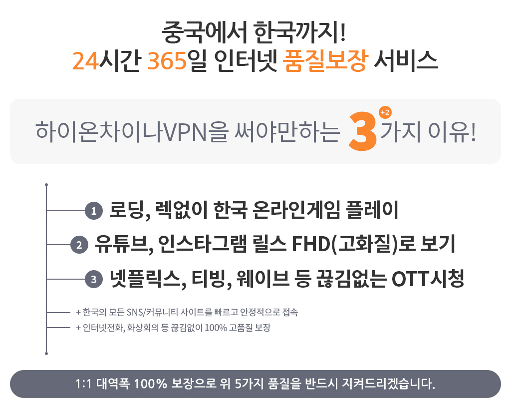 아무래도 한국인이라 한국에 있는 서비스가 중국에서 독자적으로 제공되는 서비스보다 좀 더 편할 것이고, 넷플릭스 유튜브, 구글과 카카오 톡, 보이스 토크와 페이스 톡 같은 서비스는 중국 인터넷에서 쓸 수 없습니다. 한국 우회 접속하는 해외 VPN이 필요한 이유입니다. 활용할 수 있는 컨텐츠의 차이가 크니까요. 중국 VPN을 선택할 때 끊기는 문제와 속도 등을 잘 생각해서 골라야 합니다. 무료 vpn나 더 싼 타사 vpn의 경우 일반 공중망 인터넷 회선을 사용하면서 자주 끊기는 현상이 발생하거나 접속 장애 현상이 잦은 것이 단점입니다만, 하이 온 차이나 VPN의 경우 국제 전용 회선 IPLC직결망을 이용하여 서비스를 제공하기 때문에 끊기거나 접속 장애 현상이 없다는 것이 장점이자 내가 추천하는 이유이기도 합니다. 최근 우리 집에서 간헐적으로 인터넷이 끊김 현상을 겪으면서 인터넷 서비스는 안정성과 속도를 먼저 생각해야 한다는 것을 새삼 깨달았나요. VPN이 얼마나 빠르고도 게임 등은 좀 힘들지 않습니까?이 부분에서 문제가 되지 않습니다. 국제 전용 회선 직결망을 이용, Ping로스가 없는 빠른 속도의 한국 게임 접속과 끊어짐이 없는 플레이가 가능합니다.넷플릭스, 왓챠 등 OTT서비스를 고화질로 감상할 수 있습니다.