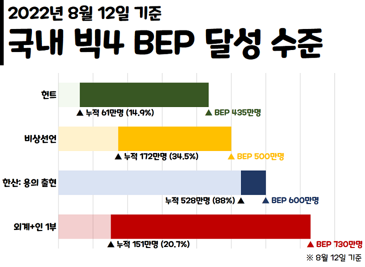 ※ [손익분기점 – 누적관객수] 기준으로 순위를 정리했습니다.※ 본 포스팅은 각종 언론보도 내용과 영화진흥위원회 통합전산망 데이터를 일일이 살펴보고 정리한 데이터를 바탕으로 작성되었으므로 혹시 탈락하거나 잘못된 내용이 있을 수 있으므로 이를 발견하실 경우 댓글로 알려주시면 즉시 반영하여 수정하도록 하겠습니다. 감사합니다。※ 본 포스팅에서 사용된 데이터는 8월 12일 기준입니다.