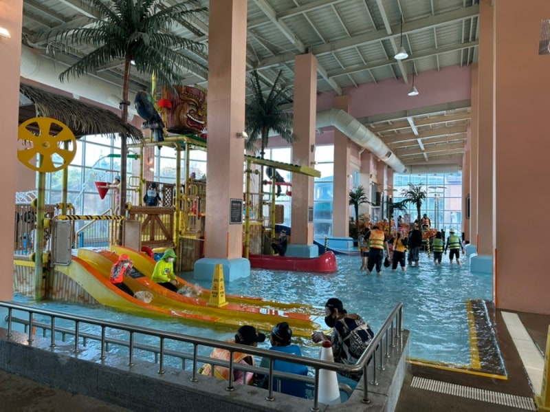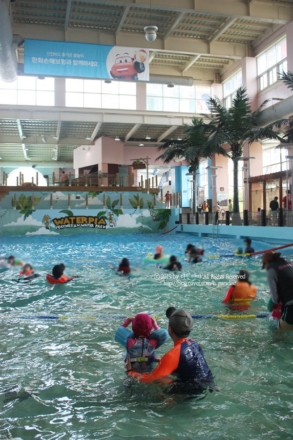 미끄럼틀이 있는 어린이 수영장 쪽에는 훨씬 물이 끓고 있었어요.위쪽에 큰 그릇에 물이 차서 다 차면 한꺼번에 쏟아지는 기구가 있는데 애들이 무서워하는지 미끄럼틀 쪽으로는 잘 안가요.그래서 파도풀 쪽에서 놀았어요.