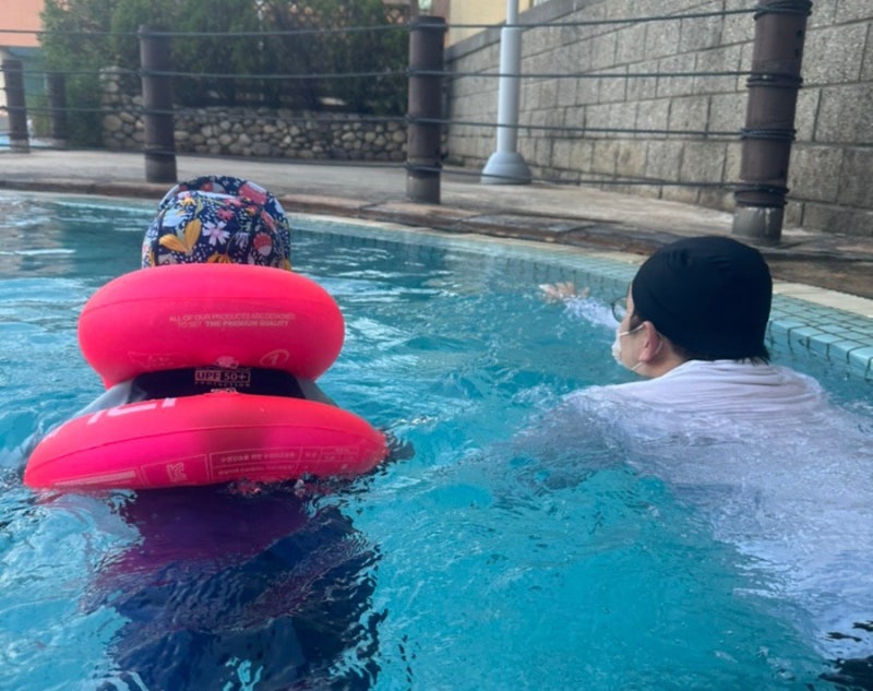 오랜만에 수영장에 가서 신나는 어린이 구명조끼에 튜브에 다 입고 물로 펄펄 물은 그렇게 따뜻한 편이 아니었습니다.좀 추울까 걱정할 정도로.