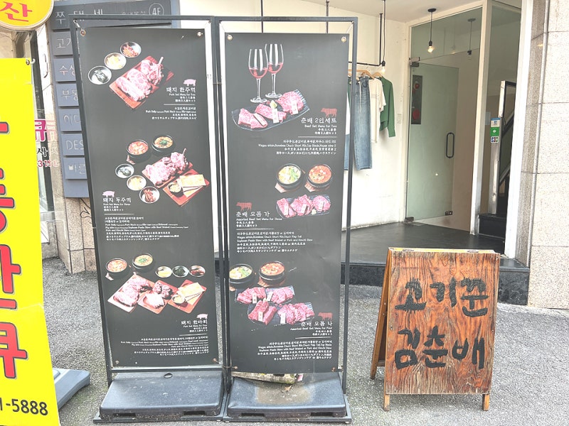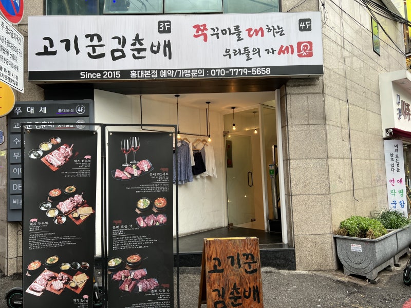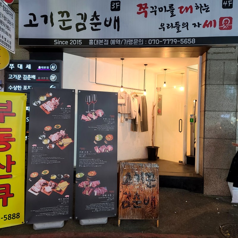 고깃집 김춘배 홍대 본점 위치 : 서울시 마포구 홍익로3길 36 3층 영업 : 오전 1230분 ~ 오후 10시 30분까지 (토일 오전 12시 ~ 오후 10시까지) 문의 : 0507-1432-3663 주요 메뉴 : 소돼지 2인 세트 58000원, 돼지 1마리 89000원, 돼지 1마리 89000원 등 홍대에서 친구들과 약속이 있거나 먹을만한 가게가 있으니 소개해 본다. 위치는 홍대 곱창 골목을 따라 올라가면 보여.