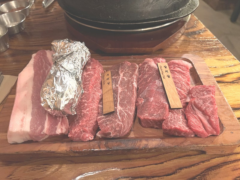 세트 메뉴가 다양하게 있다는 게 이 집만의 장점, 우리 일행은 소와 돼지를 동시에 즐길 수 있는 소+돼지 2인 세트를 주문했다.