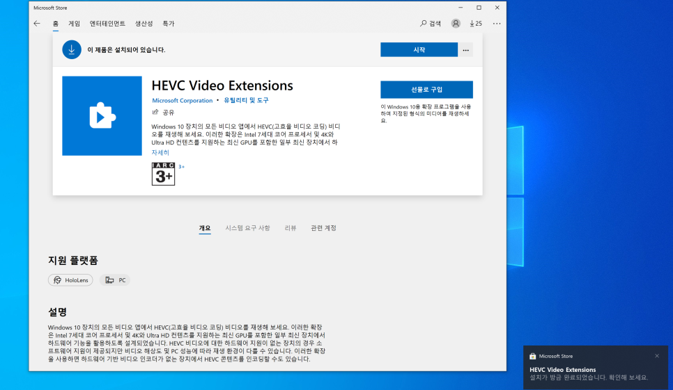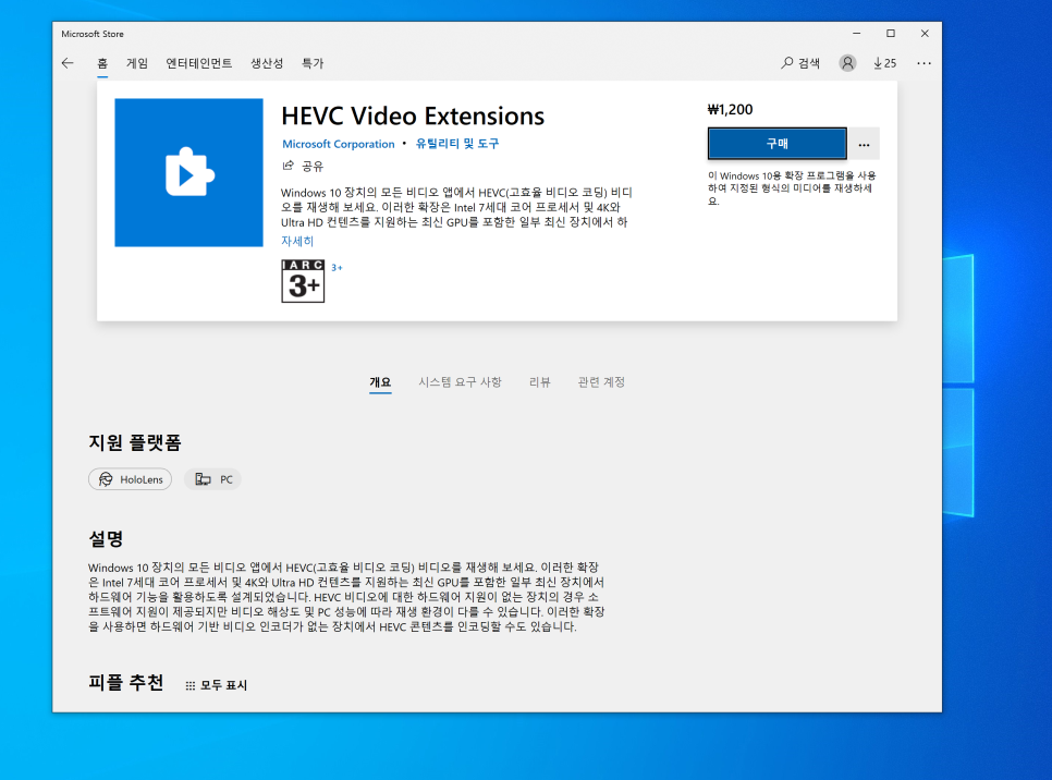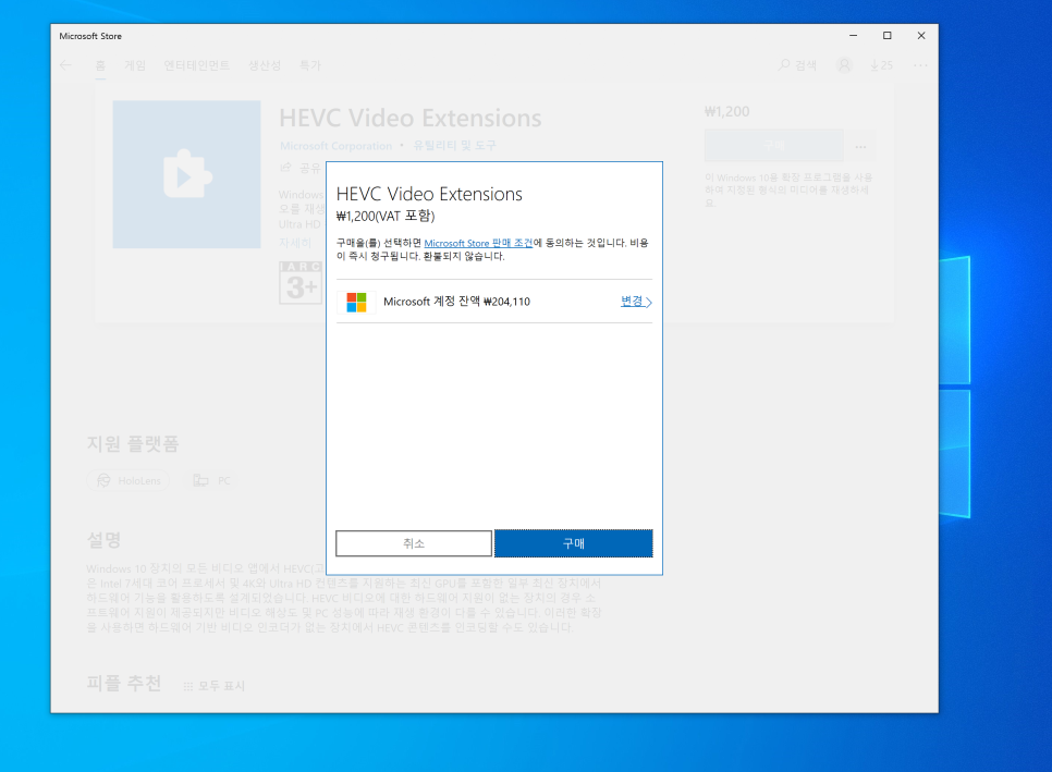 HEVC Video Extensions 유료 코덱을 마지막으로 구입하였습니다.