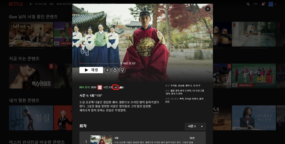 Chrome 브라우저 Netflix Ki ngdombross 선택화면, 많은 사용자가 사용하고 있는 구글의 Chrome 브라우저에서 Netflix에 접속하여 “Kingdom”을 선택한 화면입니다.
