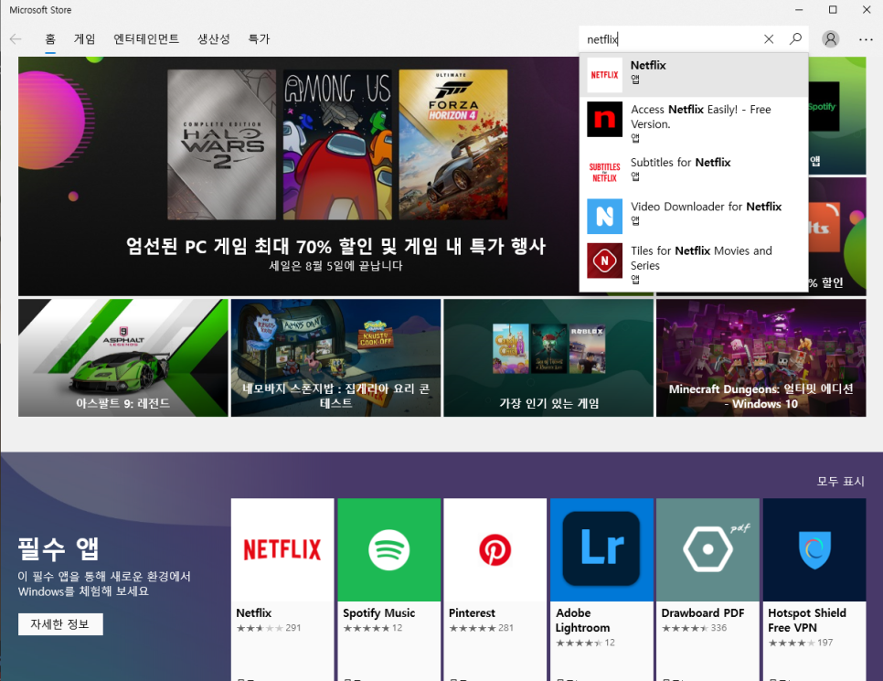 검색창에 굳이 입력 안하셔도 MS스토어 첫 페이지의 필수앱에서 바로 찾으실 수 있어요. (웃음)